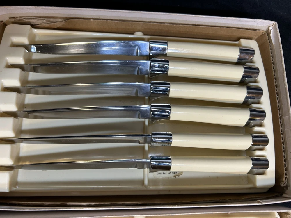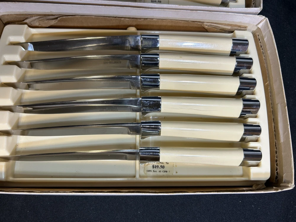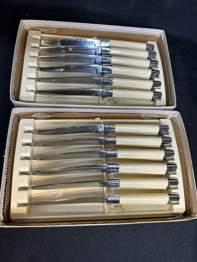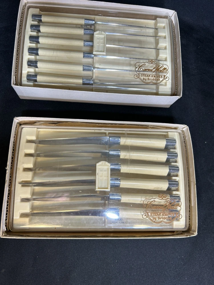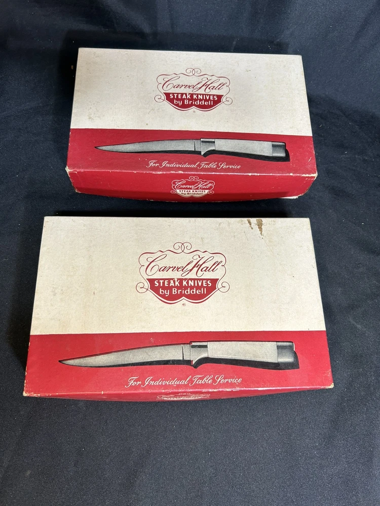 This is for two (2) 6-knife sets of vintage Carvel Hall Steak Knives by Briddell U.S.A. These knives appear to have never been used with the original price sticker ($19.50!) in the trays! Made of fine quality stainless steel with an excellent edge, the knives come with their original and convenient storage tray and in the original boxes. Good quality never goes out of style!
