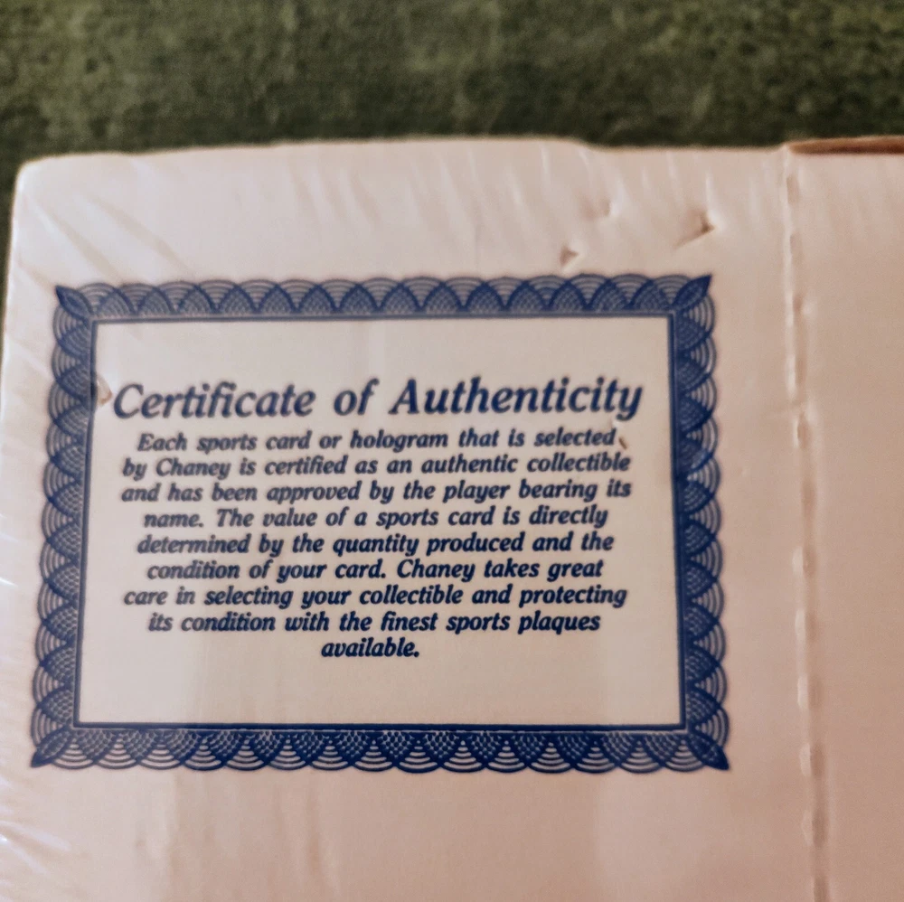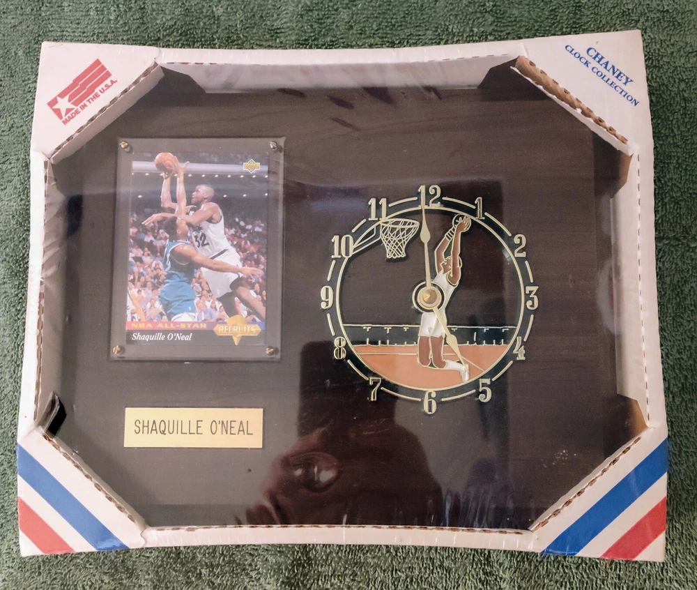 A vintage Chaney Clock Collection wall clock from 1986 featuring Shaquille O'Neal in a traditional style. This rectangular clock has a glossy finish with a wooden frame and plastic materials. It is powered by a quartz battery and showcases a basketball theme. This unique NBA franchise collectible includes a plaque and card, making it a special addition for fans of Shaquille O'Neal and basketball memorabilia. This item is sealed and new in original packaging with a small hole in the clear plastic as shown in the pictures. Please feel free to ask any questions before purchasing and thanks for looking A1