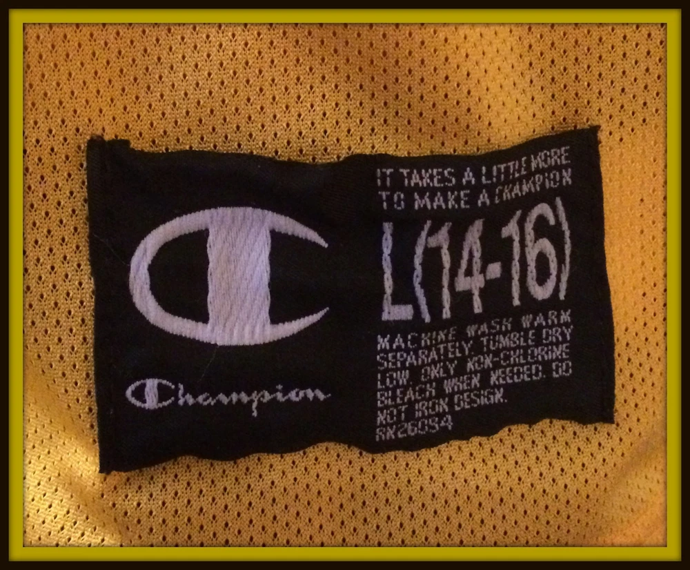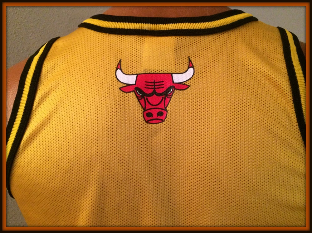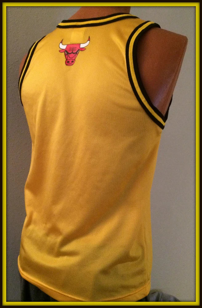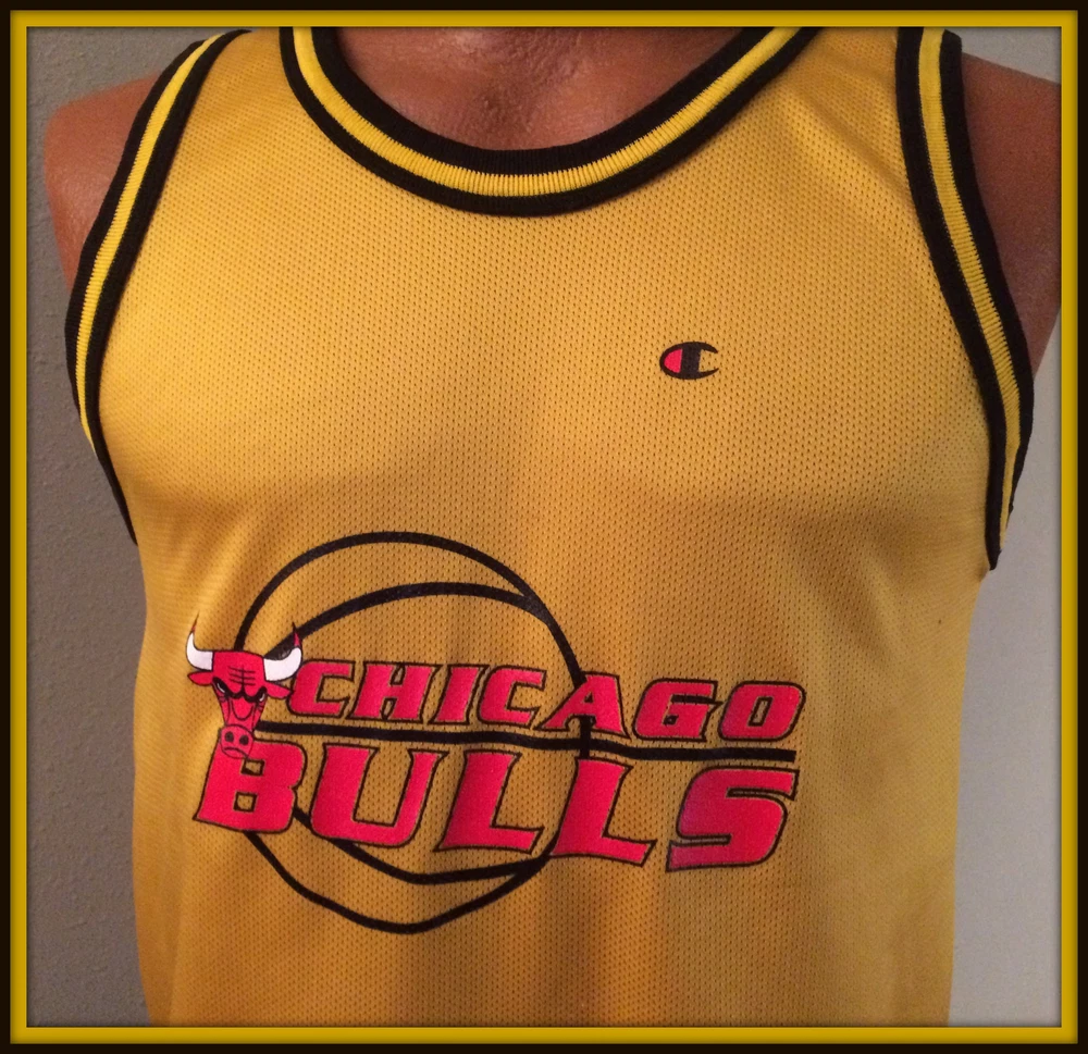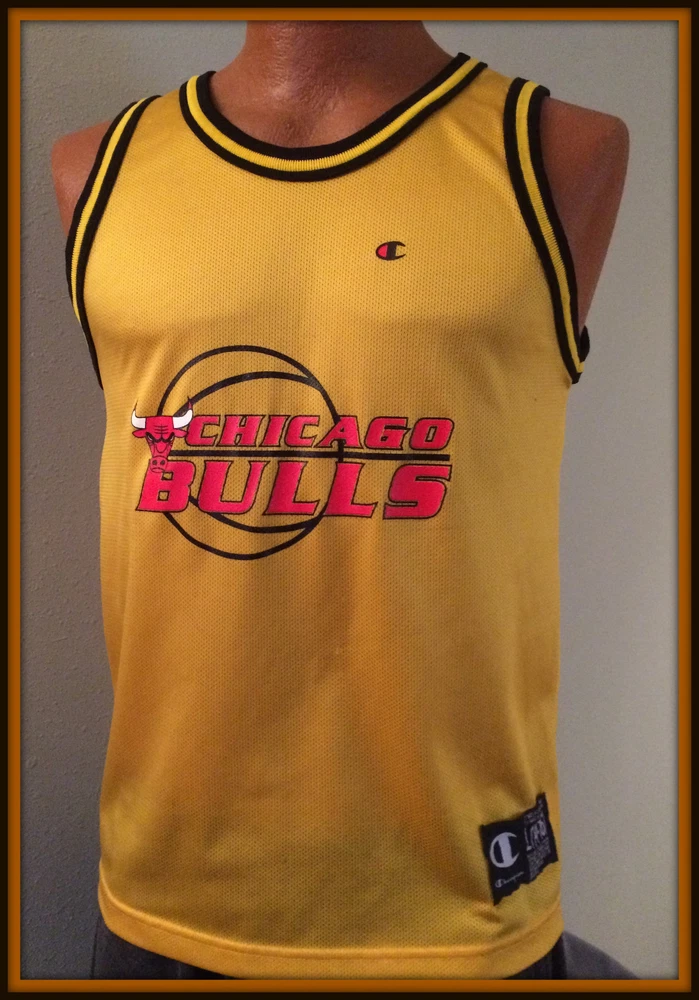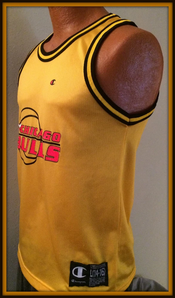 VINTAGE GOLD CHICAGO BULLS CHAMPION JERSEY. LIGHT WEAR, WITHOUT TAGS. YOUTH LARGE 14-16, MEASURES 19-20 INCHES ARMPIT TO ARMPIT, 17 INCHES ARMPIT TO BOTTOM HEM. FEATURES SCREEN PRINTED LOGO AND NAME. SHIPPING FREE FIRST CLASS. THANKS FOR LOOKING AND IF YOU HAVE THE TIME PLEASE VISIT OUR EBAY STORE. Be sure to add us to your favorites list .