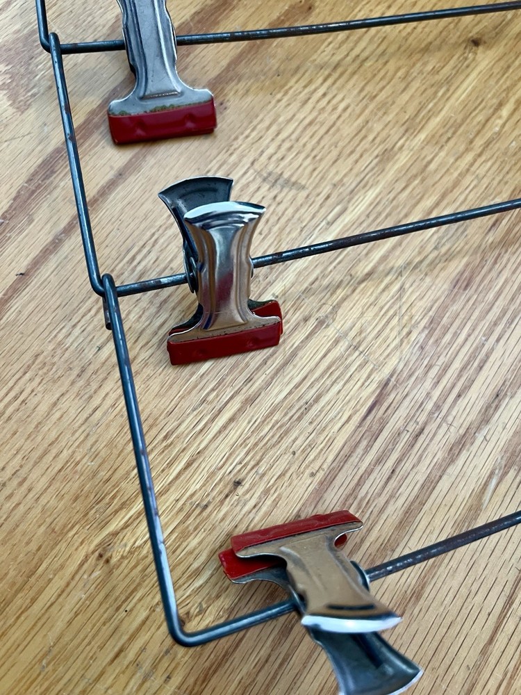 This vintage closet coat hanger pants clip holder is a metal coat hook with a single hook ideal for organizing and storing coats, hats, and other items in your home. The sturdy metal construction ensures durability and longevity, making it a practical and stylish addition to any closet or entryway. Ideal for keeping your outerwear neat and easily accessible, this hanger adds a touch of retro charm to your home decor.