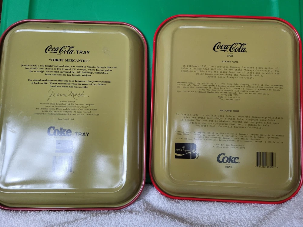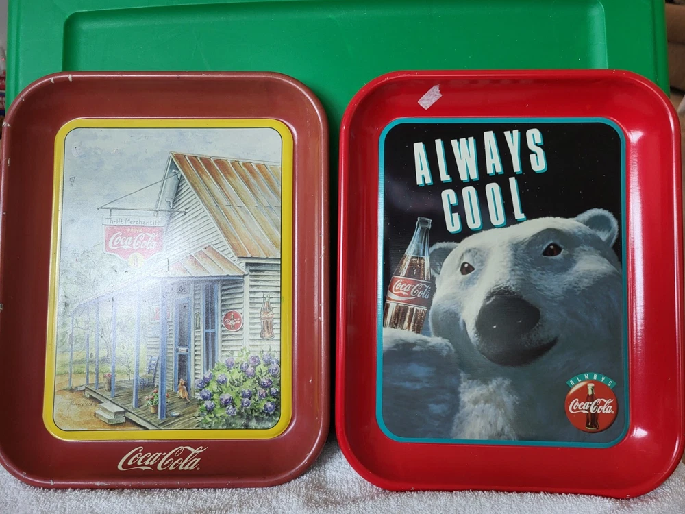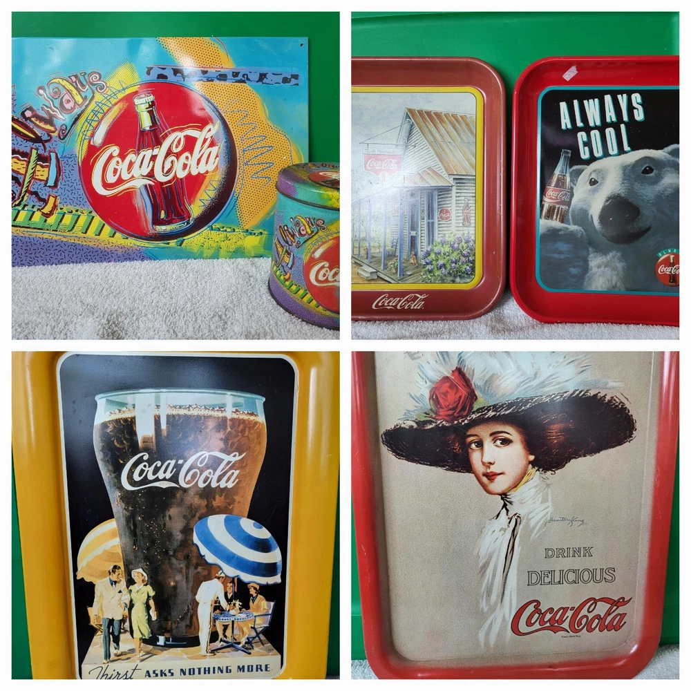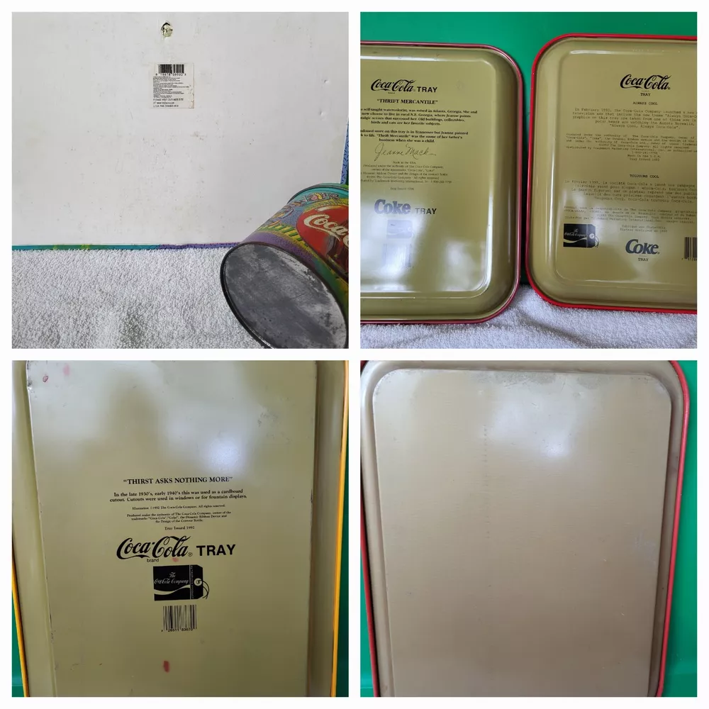 Product Details: * Lot of 6 Vintage Coca Cola Collectables * Pre-owned, Reproductions 1.) 2 Blue Vintage Coca Cola Items: One is a Coke Tin, 5 inches tall, Round One is a Coke Picture/Tin, 1997 Reproduction, 15" 1/2 X 10 inches Retro 2.) 1 Coca Cola Tray, " Thrift Mercantile",1994 Reproduction, 13" X 10" 1/2 inches 3.) 1 Coca Cola Tray, "Always Cool", 1993 Reproduction, 13" X 10" 1/2 inches 4.) 1 Coca Cola Tray, " Thirst Asks Nothing More", 1992 Reproduction, 17" 1/2 X 13" inches 5.) 1 Coca Cola Tray, "Hamilton King 1909 Girl", 1971 Reproduction, 14" 3/4 X 11 inches All these Coca Cola items are Vintage and may show signs of wear & tear. These Coca Cola collectables are in good condition. Please review all pictures before purchasing. Sold As Is. Any questions please feel free to message me.