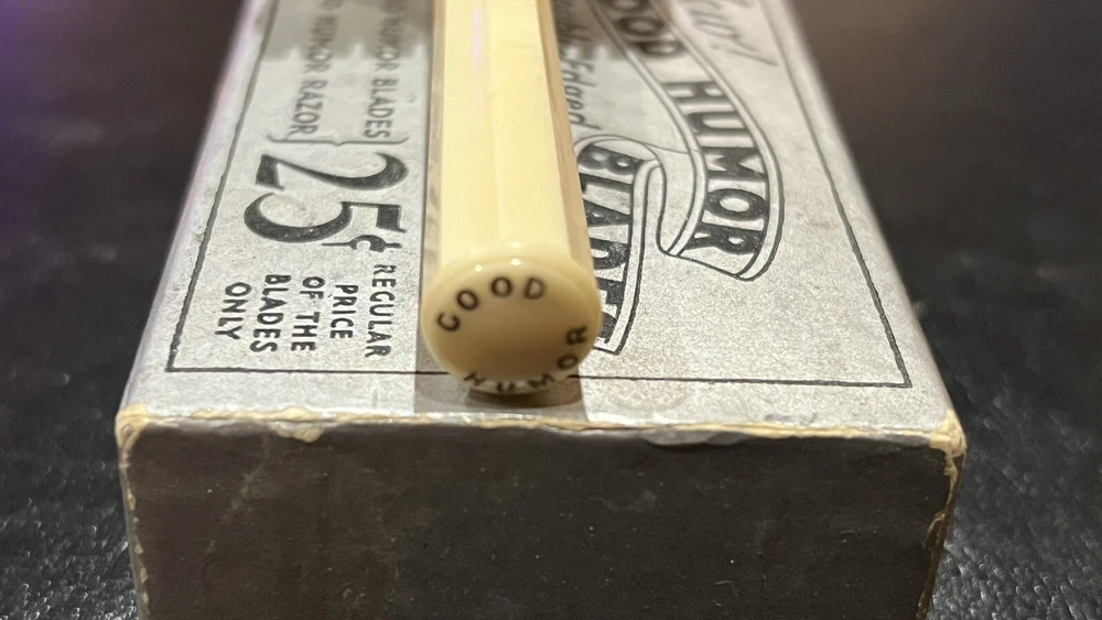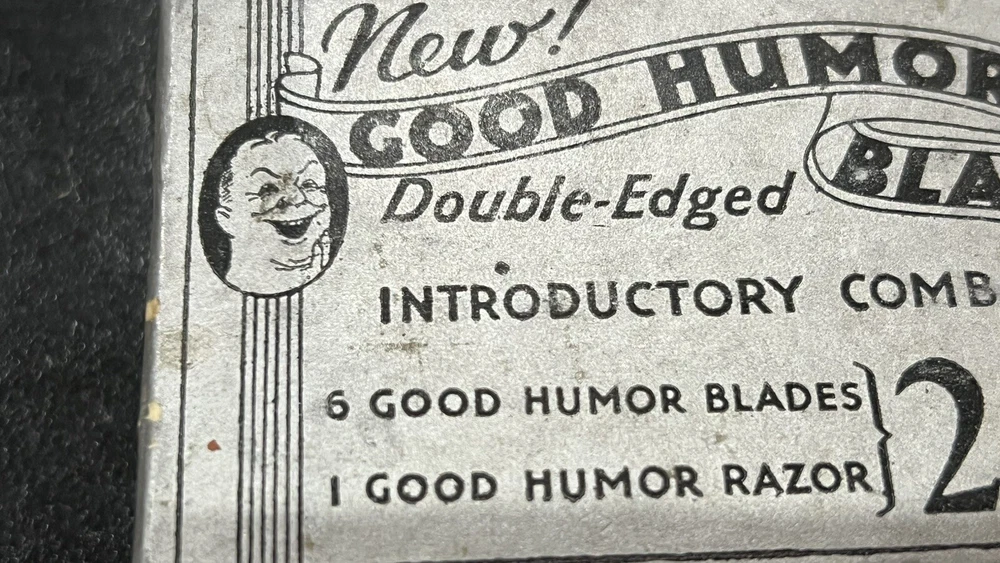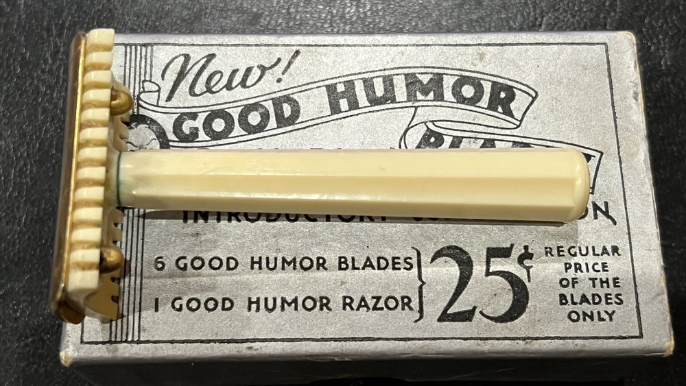 This listing is for a: VINTAGE Conrad 32's "GOOD HUMOR" Two-Piece Open Comb Type Double edge Safety Razor Comes with original box Razor has Good Humor stamped on end of handle In the early 30's Good Humor (TM) Blades were sold under the J.C. Penny house label and MFG by Prybrands Inc. This is a white blade base and handle razor with gold tone cap This item will make a great addition to your Barber / Razor Collection. Please see all photos as they are part of the description