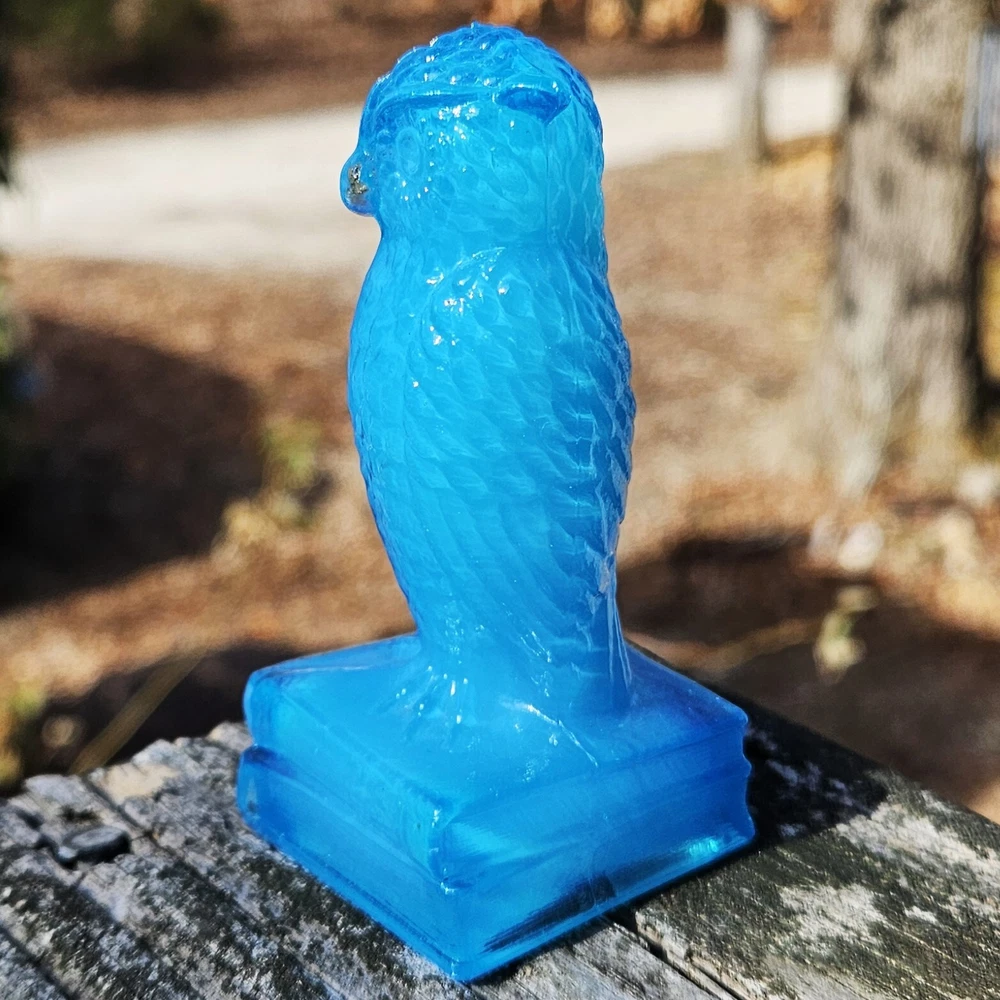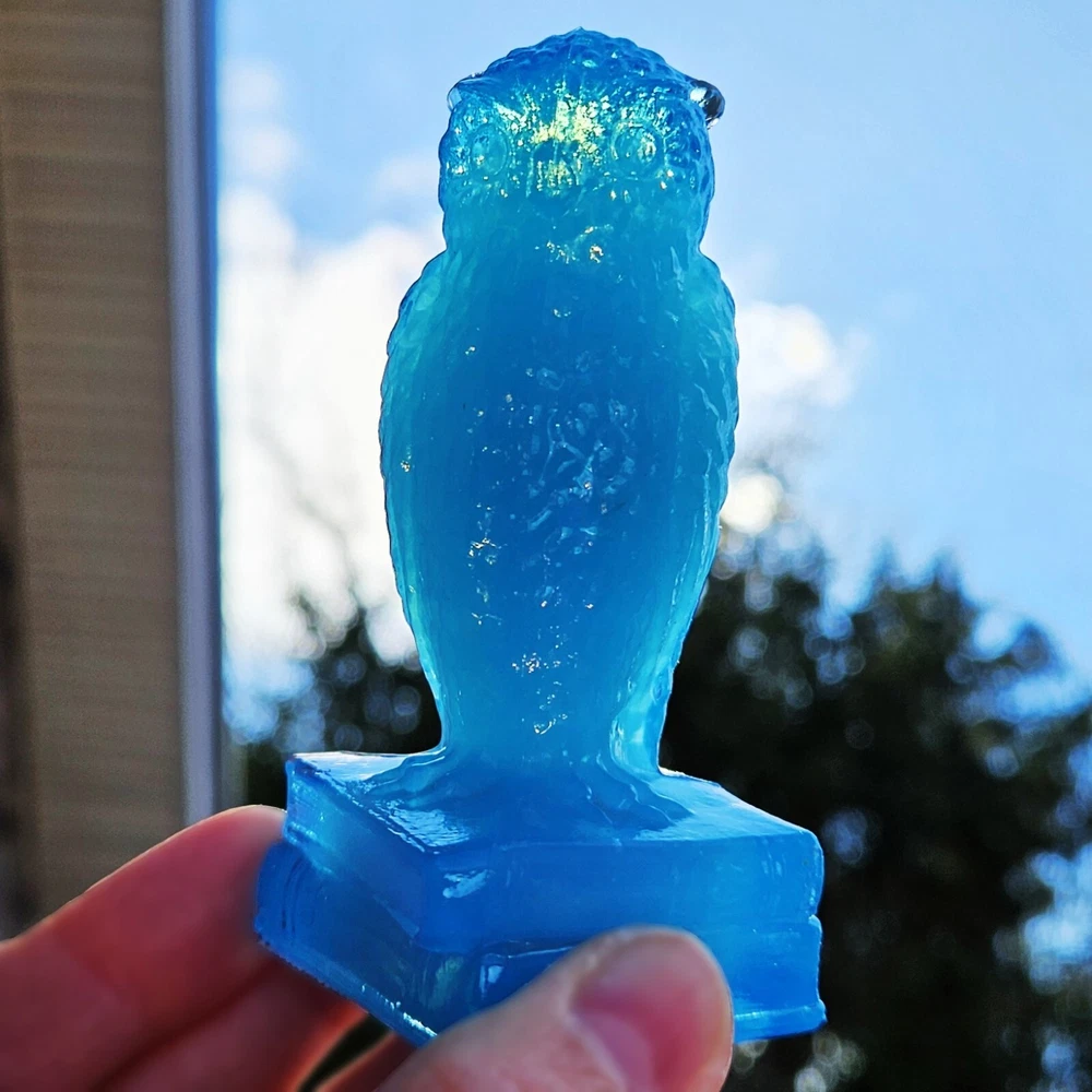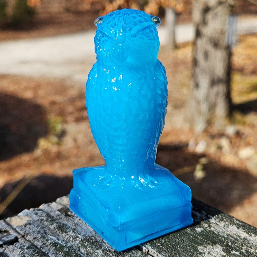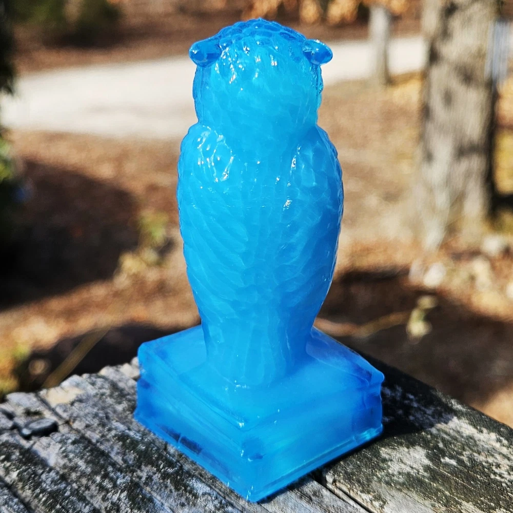 Up for auction is a Degenhart glass owl in the color "Chad's Little Boy Blue" (#179). This is a gorgeous opaque turquoise blue with opalescence in the head. It glows pale green under a 365nm blacklight due to Manganese in the glass. It's in excellent condition with no flaws of any kind. It looks stunning in the sunlight. It stands 3.5 inches tall and has the Degenhart "D" embossed on the bottom of the figurine. Degenhart Glass made this owl from 1967 to 1978. The owl was permanently retired in 1978 and never made again. All pictures were taken in natural outdoor lighting. I'm a highly experienced glass shipper, so you can rest assured that your item will be very carefully wrapped and will arrive safely. Please read below for info on the blacklight/UV light I use and recommendations on the best way to view your owl under a blacklight. 1. What blacklight do you use? The blacklight I use is the Lumenshooter S3 that I purchased through Amazon. This has a 365nm wavelength which is the best for viewing the fluorescing properties of Cadmium, Manganese and Selenium. Uranium glows even brighter than normal with this blacklight. 2. Are 365nm and 395nm blacklights the same? The are not! :) A 395nm blacklight emits a violet light and creates a less intense glow. It is best suited for Uranium glass only. I highly recommend purchasing a blacklight with a 365nm wavelength, as they have the advantage of not emitting violet light, which can be a distraction and create a less intense glow. Most objects containing Cadmium, Manganese, Selenium and Uranium will fluoresce strongest under a 365nm black light. 3. What is the best way to view my Degenhart Owl under a blacklight? I recommend using a completely dark room or closet with no additional lighting that could be a distraction. This will give you the brightest glow possible. All UV pictures in my listings are taken in a completely dark closet with only my blacklight and my phone on the night setting. Thank you for looking and please let me know if you have any questions. :)