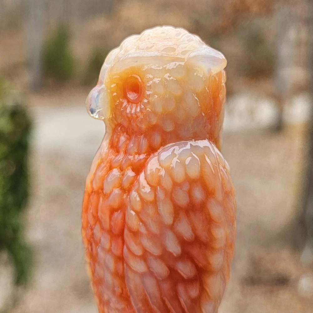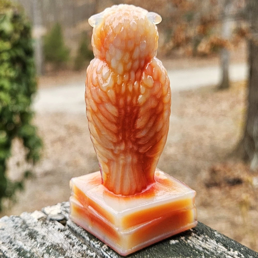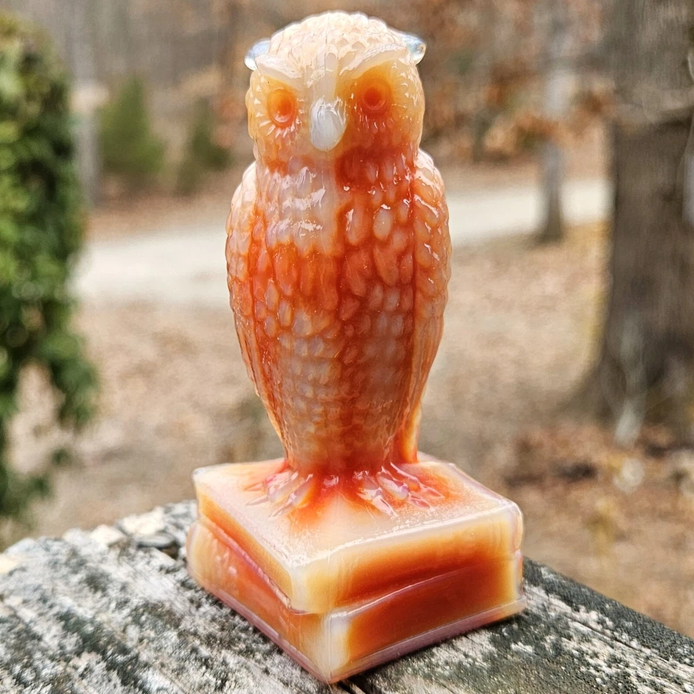Up for auction is a RARE Degenhart slag glass owl in the color "Bloody Mary #2" (made in 1973). This color consists of cream custard glass with red and orange slag on top. This is a stunning color in person. It glows bright orange and red under a 365nm blacklight due to Cadmium and Selenium in the glass. It's in excellent condition with no flaws of any kind. It looks stunning in the sunlight. It stands 3.5 inches tall and has the Degenhart "D" embossed on the bottom of the figurine. Degenhart Glass made this owl from 1967 to 1978. The owl was permanently retired in 1978 and never made again. All pictures were taken in natural outdoor lighting. I'm a highly experienced glass shipper, so you can rest assured that your item will be very carefully wrapped and will arrive safely. Please read below for info on the blacklight/UV light I use and recommendations on the best way to view your owl under a blacklight. 1. What blacklight do you use? The blacklight I use is the Lumenshooter S3 that I purchased through Amazon. This has a 365nm wavelength which is the best for viewing the fluorescing properties of Cadmium, Manganese and Selenium. Uranium glows even brighter than normal with this blacklight. 2. Are 365nm and 395nm blacklights the same? The are not! :) A 395nm blacklight emits a violet light and creates a less intense glow. It is best suited for Uranium glass only. I highly recommend purchasing a blacklight with a 365nm wavelength, as they have the advantage of not emitting violet light, which can be a distraction and create a less intense glow. Most objects containing Cadmium, Manganese, Selenium and Uranium will fluoresce strongest under a 365nm black light. 3. What is the best way to view my Degenhart Owl under a blacklight? I recommend using a completely dark room or closet with no additional lighting that could be a distraction. This will give you the brightest glow possible. All UV pictures in my listings are taken in a completely dark closet with only my blacklight and my phone on the night setting. Thank you for looking and please let me know if you have any questions. :)