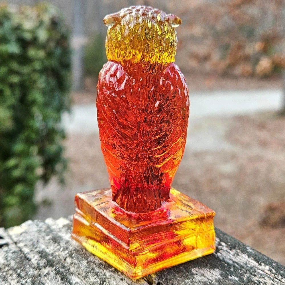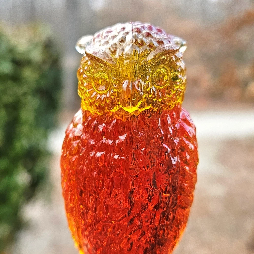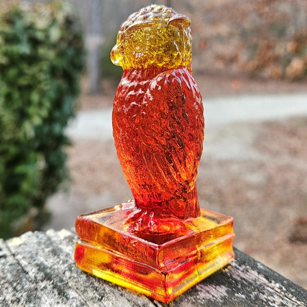 Up for auction is a vintage Degenhart slag glass owl in the color "Desert Sun Warmed in" (made in 1975). This color consists of a golden yellow with an intense orangish-red center. It was originally bought as "warmed in" because the red center was darker and covered more area than the regular "Desert Sun". It glows bright orange and red under a 365nm blacklight due to Cadmium and Selenium in the glass. It's in excellent condition with no flaws of any kind. It looks stunning in the sunlight. It stands 3.5 inches tall and has the Degenhart "D" embossed on the bottom of the figurine. Degenhart Glass made this owl from 1967 to 1978. The owl was permanently retired in 1978 and never made again. All pictures were taken in natural outdoor lighting. I'm a highly experienced glass shipper, so you can rest assured that your item will be very carefully wrapped and will arrive safely. Please read below for info on the blacklight/UV light I use and recommendations on the best way to view your owl under a blacklight. 1. What blacklight do you use? The blacklight I use is the Lumenshooter S3 that I purchased through Amazon. This has a 365nm wavelength which is the best for viewing the fluorescing properties of Cadmium, Manganese and Selenium. Uranium glows even brighter than normal with this blacklight. 2. Are 365nm and 395nm blacklights the same? The are not! :) A 395nm blacklight emits a violet light and creates a less intense glow. It is best suited for Uranium glass only. I highly recommend purchasing a blacklight with a 365nm wavelength, as they have the advantage of not emitting violet light, which can be a distraction and create a less intense glow. Most objects containing Cadmium, Manganese, Selenium and Uranium will fluoresce strongest under a 365nm black light. 3. What is the best way to view my Degenhart Owl under a blacklight? I recommend using a completely dark room or closet with no additional lighting that could be a distraction. This will give you the brightest glow possible. All UV pictures in my listings are taken in a completely dark closet with only my blacklight and my phone on the night setting. Thank you for looking and please let me know if you have any questions. :)
