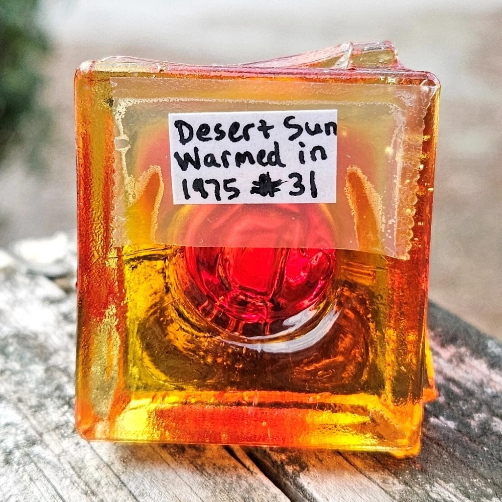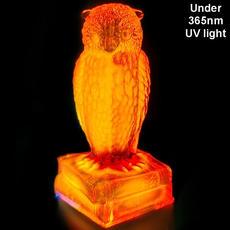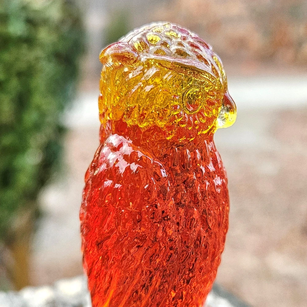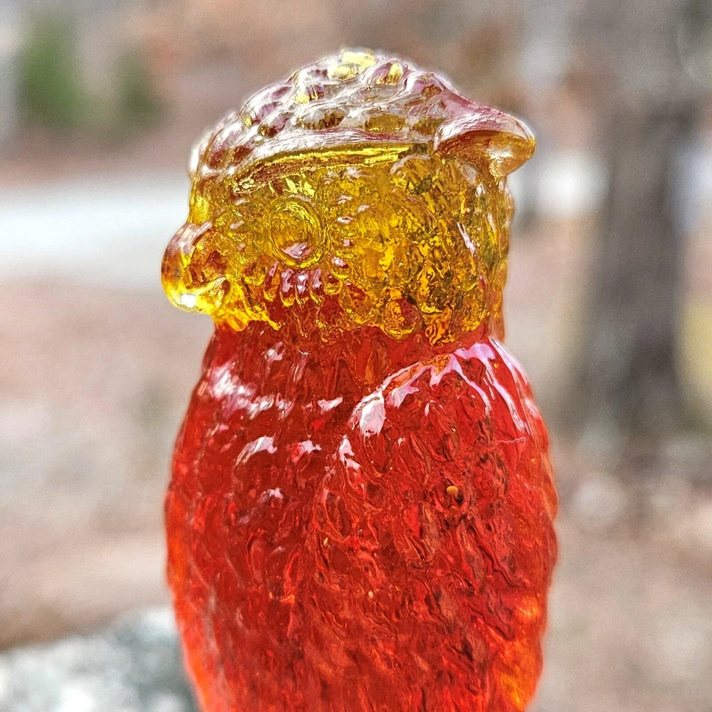 Up for auction is a vintage Degenhart slag glass owl in the color "Desert Sun Warmed in" (made in 1975). This color consists of a golden yellow with an intense orangish-red center. It was originally bought as "warmed in" because the red center was darker and covered more area than the regular "Desert Sun". It glows bright orange and red under a 365nm blacklight due to Cadmium and Selenium in the glass. It's in excellent condition with no flaws of any kind. It looks stunning in the sunlight. It stands 3.5 inches tall and has the Degenhart "D" embossed on the bottom of the figurine. Degenhart Glass made this owl from 1967 to 1978. The owl was permanently retired in 1978 and never made again. All pictures were taken in natural outdoor lighting. I'm a highly experienced glass shipper, so you can rest assured that your item will be very carefully wrapped and will arrive safely. Please read below for info on the blacklight/UV light I use and recommendations on the best way to view your owl under a blacklight. 1. What blacklight do you use? The blacklight I use is the Lumenshooter S3 that I purchased through Amazon. This has a 365nm wavelength which is the best for viewing the fluorescing properties of Cadmium, Manganese and Selenium. Uranium glows even brighter than normal with this blacklight. 2. Are 365nm and 395nm blacklights the same? The are not! :) A 395nm blacklight emits a violet light and creates a less intense glow. It is best suited for Uranium glass only. I highly recommend purchasing a blacklight with a 365nm wavelength, as they have the advantage of not emitting violet light, which can be a distraction and create a less intense glow. Most objects containing Cadmium, Manganese, Selenium and Uranium will fluoresce strongest under a 365nm black light. 3. What is the best way to view my Degenhart Owl under a blacklight? I recommend using a completely dark room or closet with no additional lighting that could be a distraction. This will give you the brightest glow possible. All UV pictures in my listings are taken in a completely dark closet with only my blacklight and my phone on the night setting. Thank you for looking and please let me know if you have any questions. :)