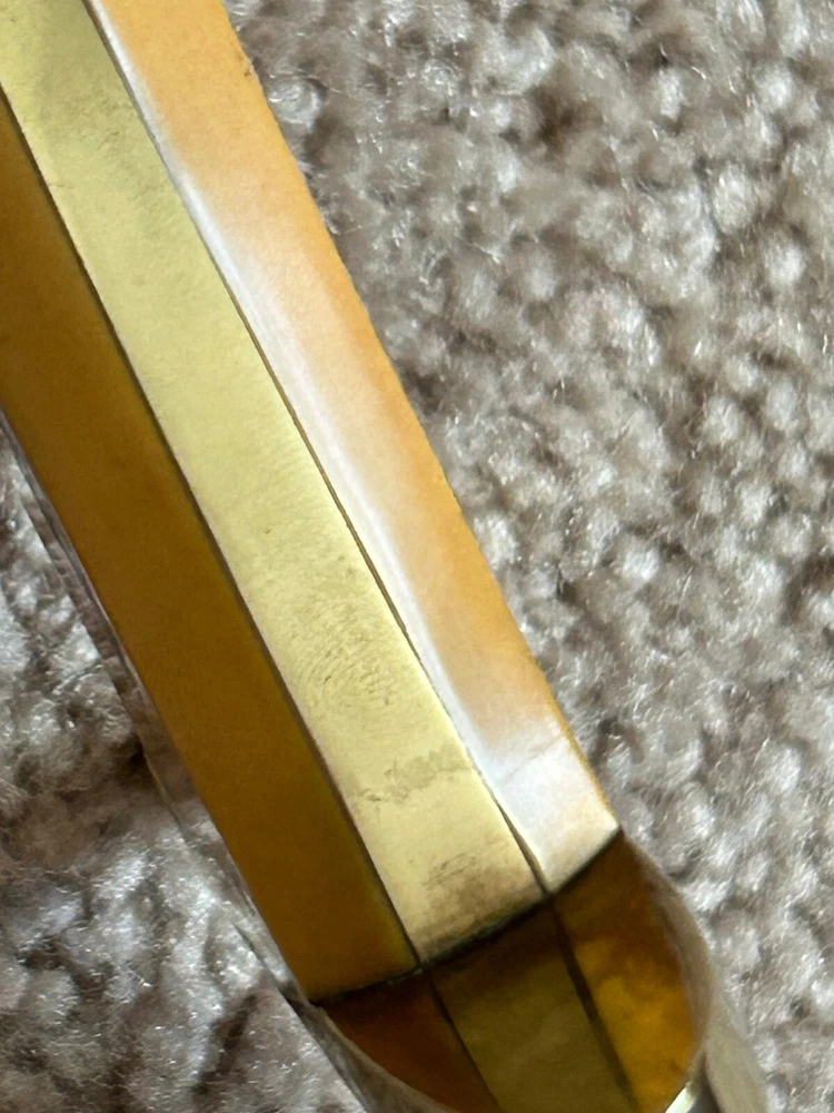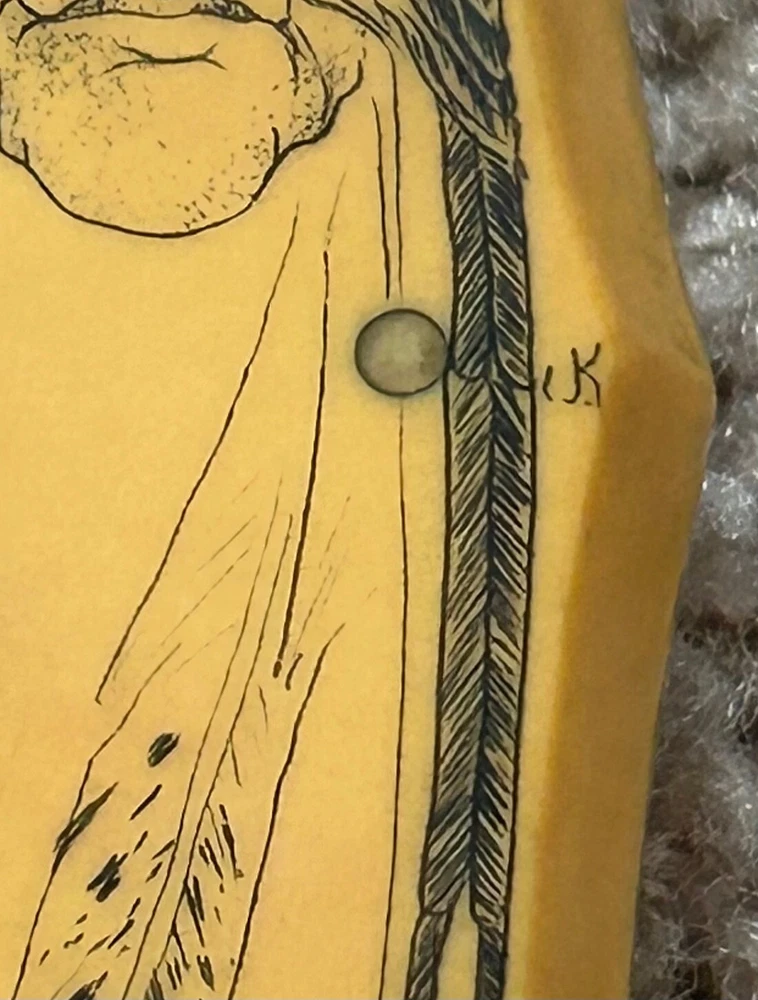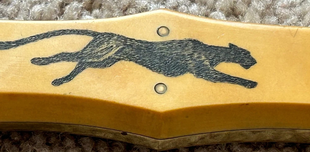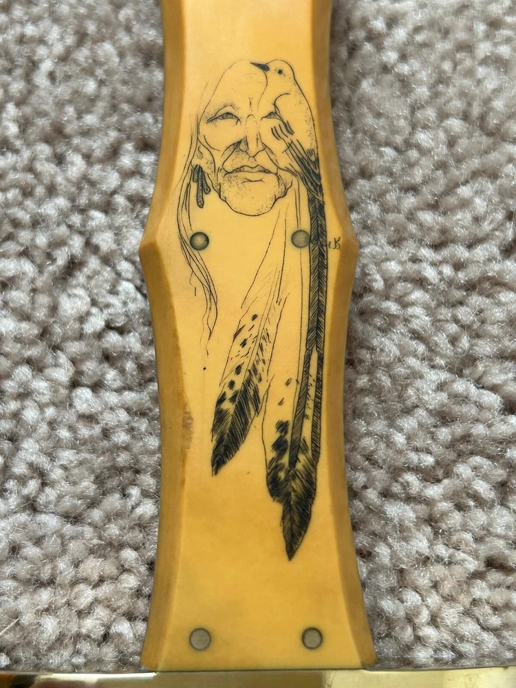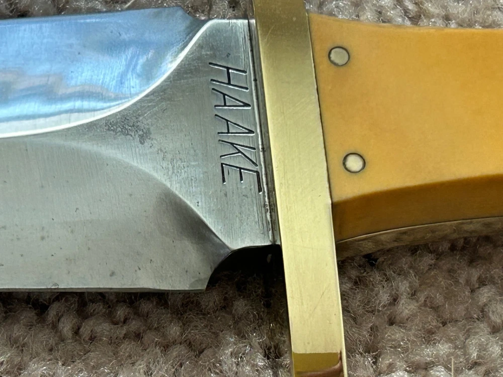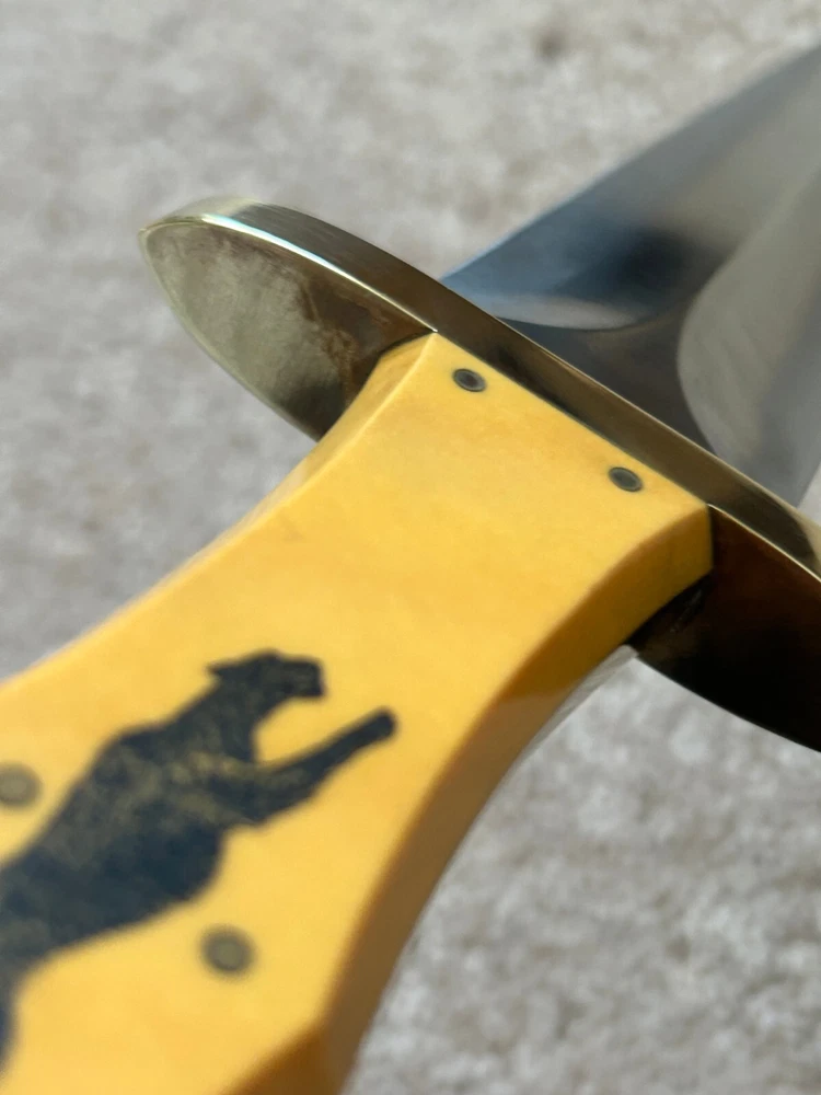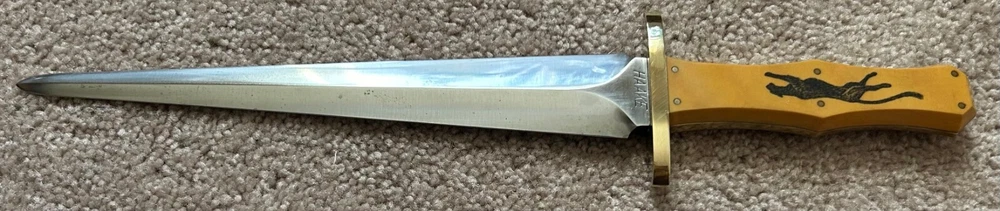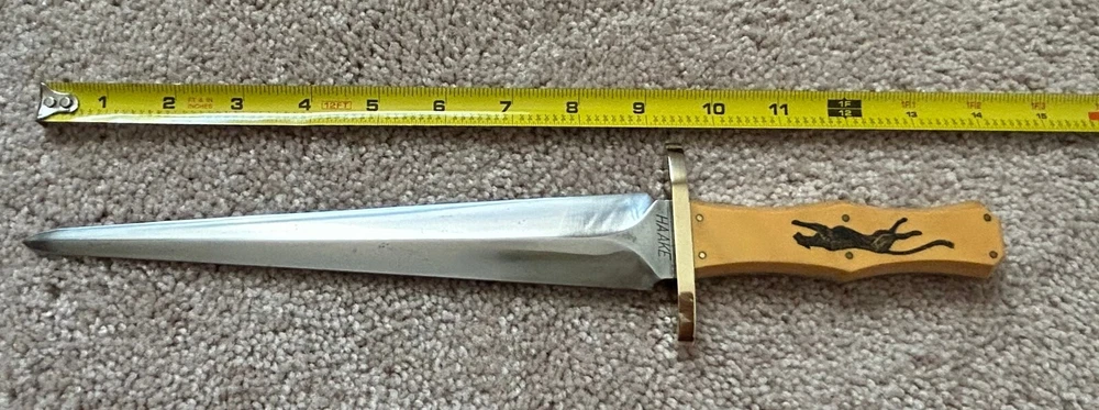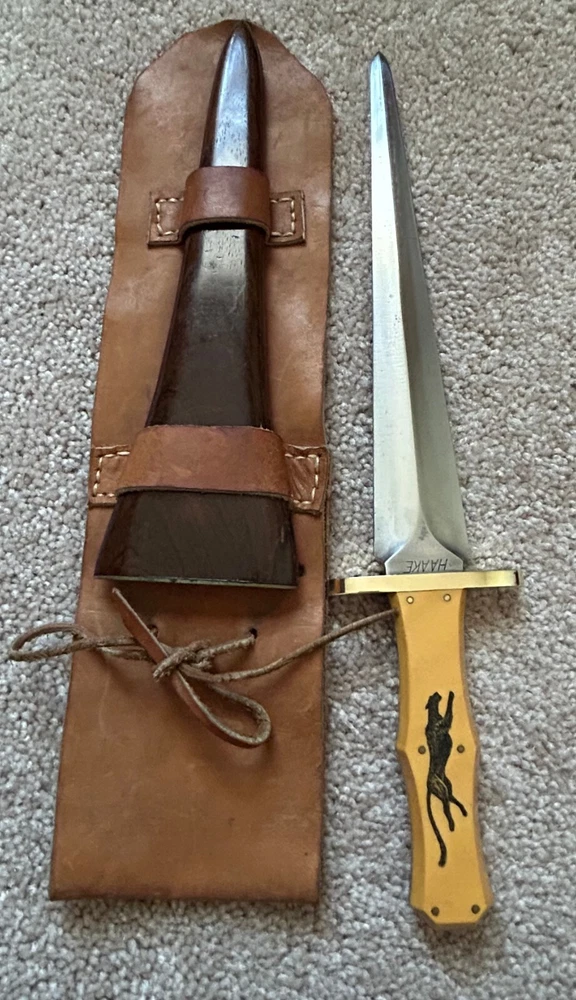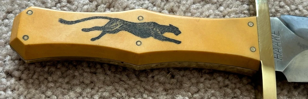 VINTAGE, HANDMADE CUSTOM ARKANSAS TOOTHPICK STYLE FIGHTING DAGGER - STAMPED 'HAAKE' FULL TAPERED TANG CONSTRUCTION, GOLDEN WESTINGHOUSE MICARTA CONTOURED COFFIN-STYLE GRIP, DOUBLE-EDGED SPEAR BLADE, FULL BRASS GUARD AND PINS NATIVE AMERICAN SCRIMSHAW ON ONE SIDE OF HANDLE SIGNED 'JK' PUMA/BLACK PANTHER SCRIMSHAW ON OTHER DOES NOT APPEAR TO HAVE EVER BEEN SHARPENED. MARKS AND SCRATCHING THROUGHOUT BLADE, SO DOES SHOW WEAR FROM HANDLING AND/OR USAGE WOODEN SCABBARD WITH LEATHER COVERING INCLUDED - ORIGINAL TO KNIFE. OVERALL LENGTH OF 14 1/8 INCHES / BLADE LENGTH OF 9 1/4 INCHES / WEIGHT OF 11.26 OZ