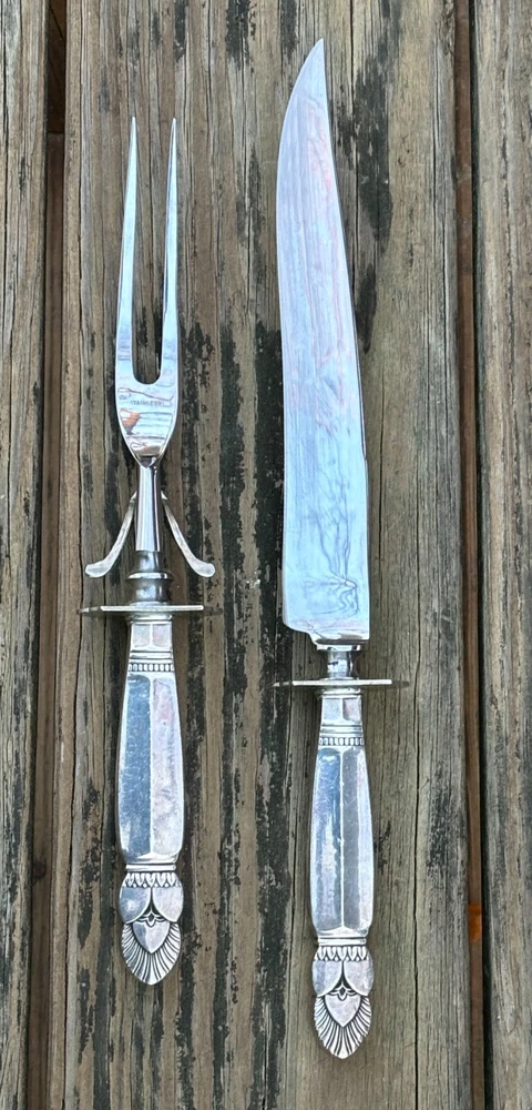 You are bidding on a vintage Frank Whiting Princess Ingrid heavyweight carving knife and fork set. Stainless steel with sterling silver handles. Beautiful deco-like design. Shipping is $10.95. Sorry I can't do free shipping on this auction. SHIPPING PRICE IS NOT NEGOTIABLE. Please note that I DO NOT GIVE PARTIAL REFUNDS for any reason. If there is a problem, you will be asked to return the item for a full refund. Check out my other auctions I will gladly combine shipping! No returns please. HAPPY BIDDING!!