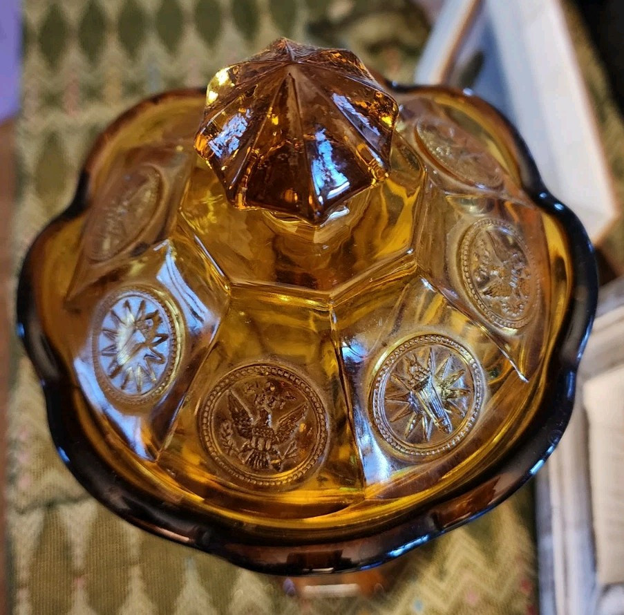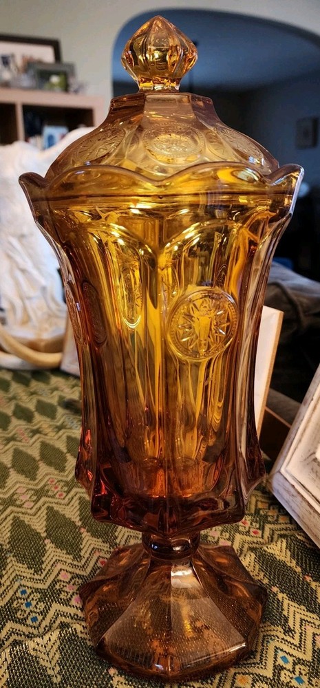 Elevate your display with the VINTAGE Fostoria Liberty Amber Art Glass Coin Design Tall Lidded Candy Dish, a stunning piece that merges functionality with artistic expression. Crafted from high-quality glass, this candy dish showcases an exquisite amber hue that adds a warm, inviting glow to any room. Its Liberty style design embodies a classic elegance, making it a timeless addition to your collection. The dish's impressive height of 13 inches commands attention while its art glass production style ensures that each piece is unique. The coin design on the lid adds a touch of historical charm, reflecting the craftsmanship of a bygone era. Whether used for special occasions or as a permanent display, this Fostoria dish is a testament to vintage artistry and sophistication.