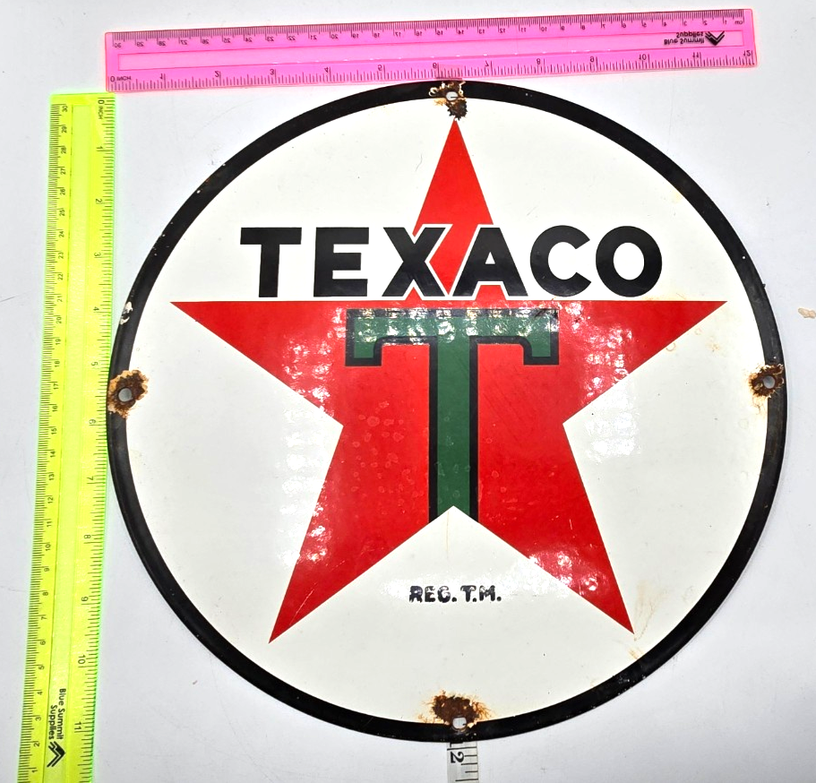 M22 The sign is 12” x 12" in diameter. Please see the pictures as they show exactly what you will receive and any imperfections. Sold as is. Please feel free to ask questions. Great for garage, man cave, game room, bar and many other uses. Will combine shipping if more than 1 item is purchased within a few days. This vintage porcelain sign is a great addition to any collection. The sign features the brand name "TEXACO" and has a colorful design. It is an original piece and perfect for those interested in gas and oil memorabilia. The sign is made in the United States and is a type of advertising for gas service stations.