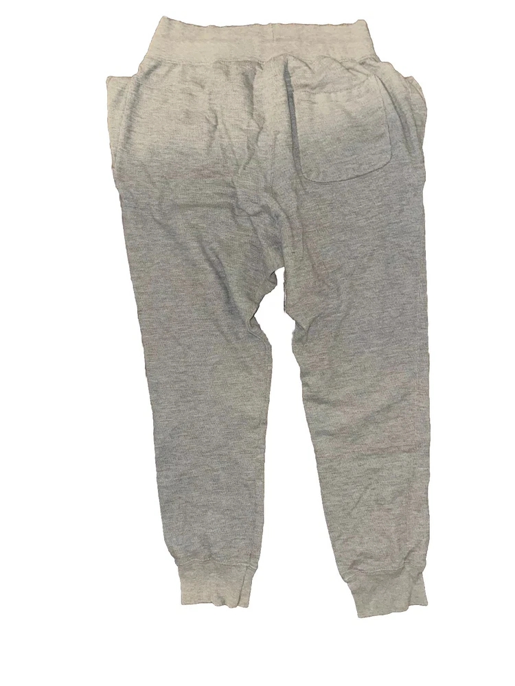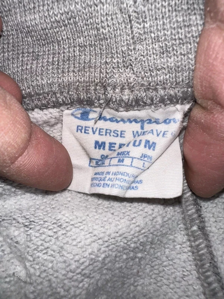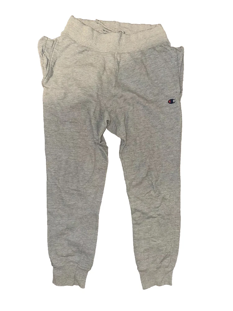 This is a pair of vintage gray Champion joggers in size M, featuring a drawstring closure and made of fleece fabric. The sweatpants have an elastic waist, pockets, and a tapered leg style, making them suitable for activewear purposes such as gym training and running. The pants have a Champion Life logo theme and a solid gray color, with a classic style and regular fit perfect for wearing in all seasons. Made of cotton material, these joggers are machine washable and designed for comfort and performance.