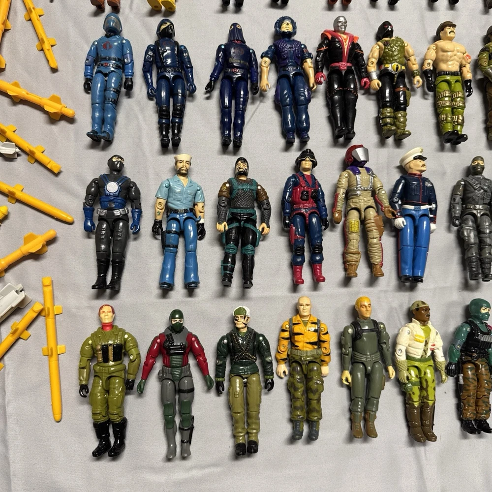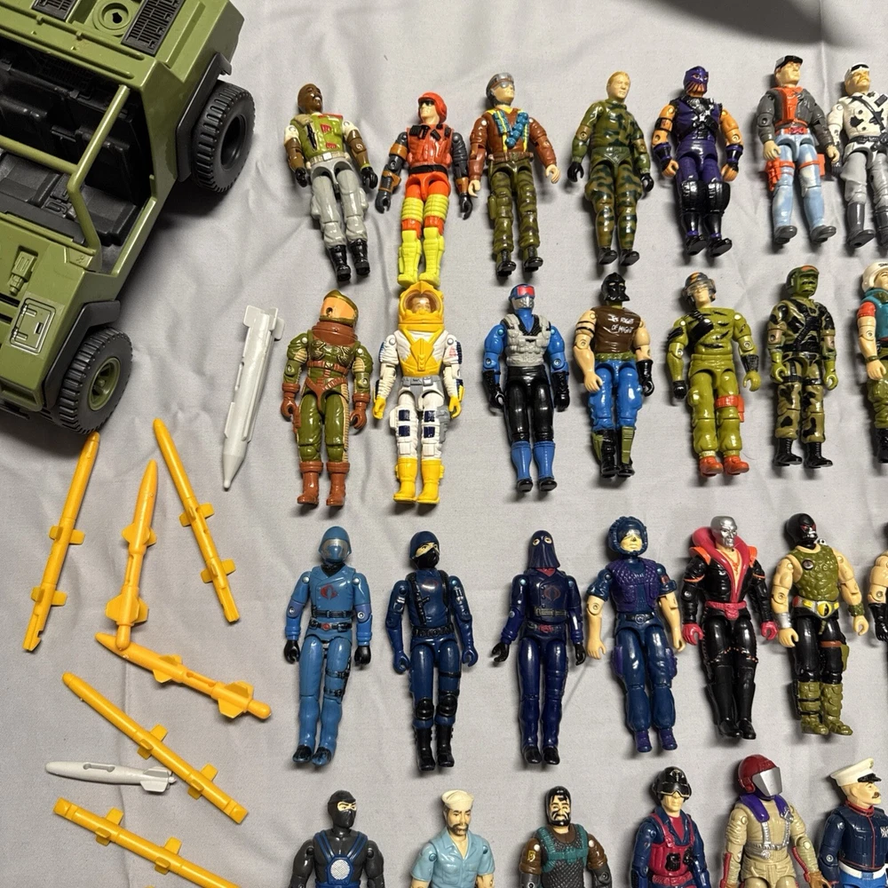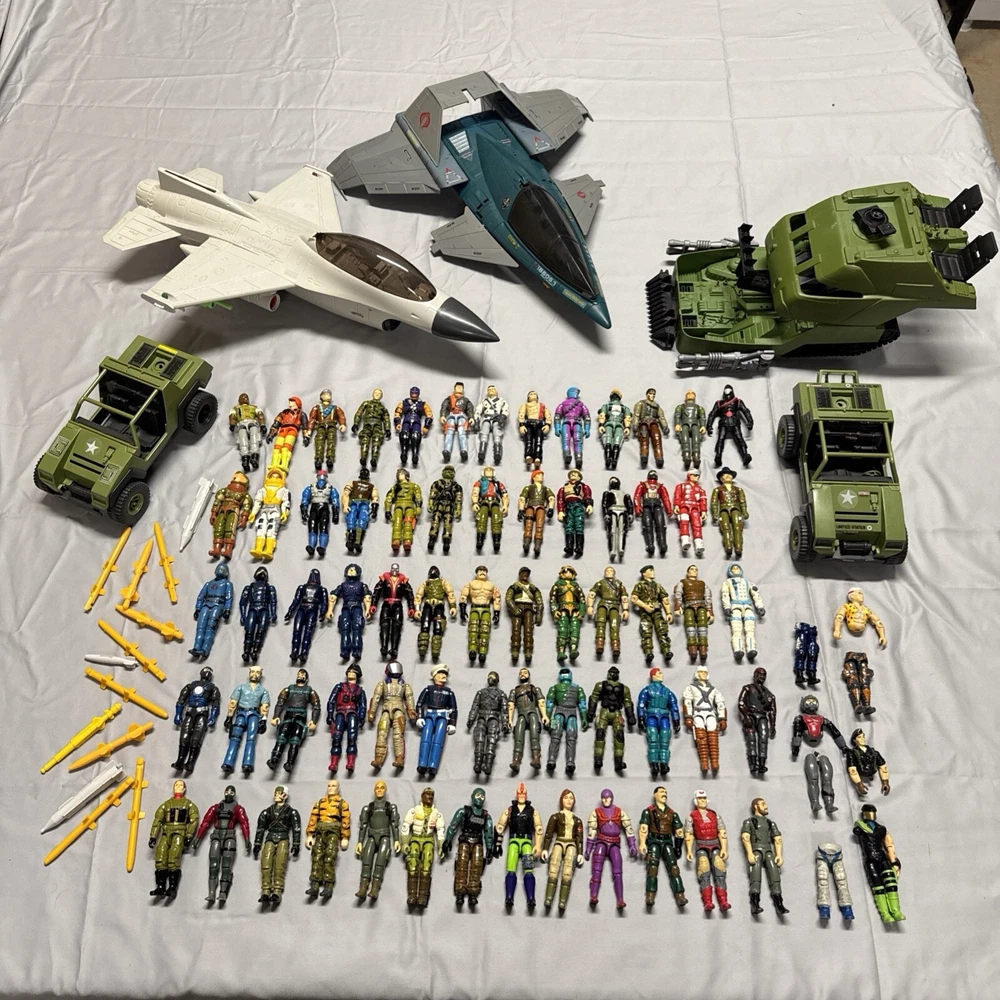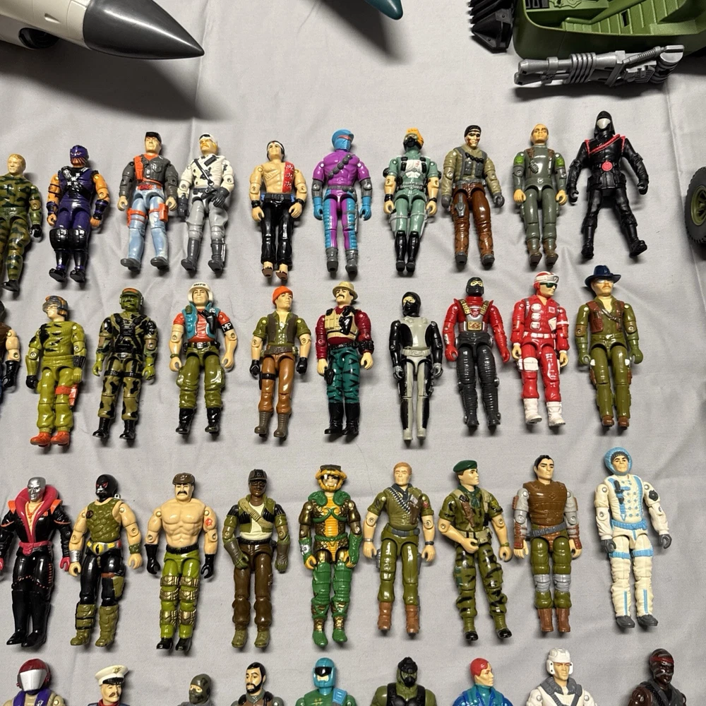 Lot of 65+ figures in good preowned condition Sold as is All figures not from same time period or set All figures have repaired elastic bands Some figures not complete 2 figures may be from McDonald’s See 2 figures have damaged crotch pieces All accessories not guaranteed to be g I Joe brand See vehicles not complete Plane in working condition. One red light not working on plane I ship every day