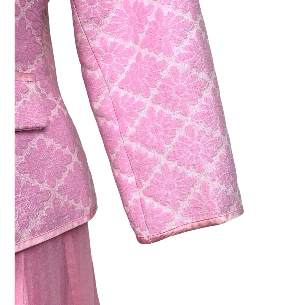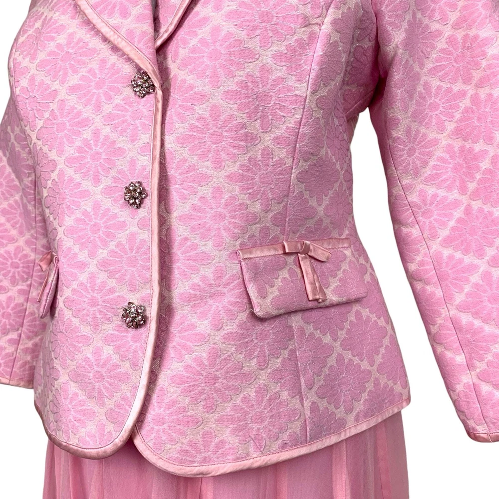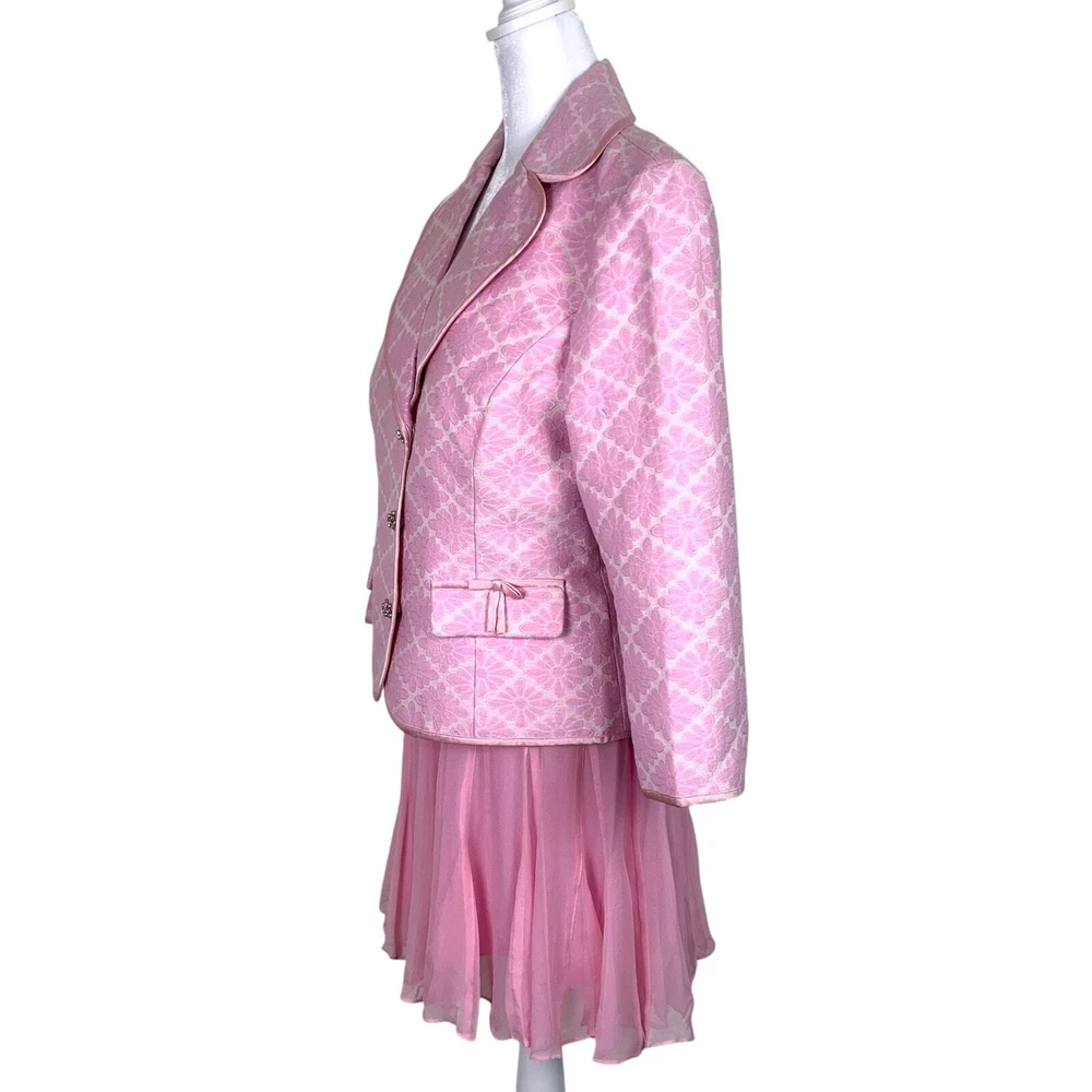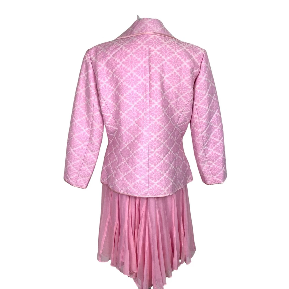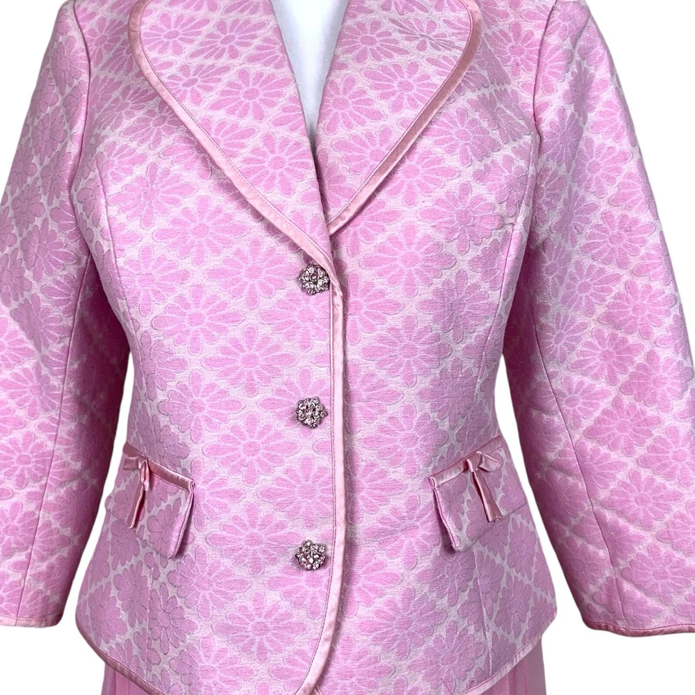 VINTAGE I.C.E. Women's Pink Brocade Jacket Sz 12 and Silk Skirt Sz 10 This is a GORGEOUS vintage suit with whimsical vibes. The Jacket (size 12) is trimmed with satin and the two front faux pockets have satin bows and is fully lined. The pink rhinestone flower buttons on the jacket add an element of pizazz!! The skirt is 100% silk, fully lined knife pleated and flowy. It has a side zipper closure. The skirt is a size 10. While the jacket and skirt are meant to be worn as a set, these two pieces will also compliment many other items in your closet for some fun stylish looks. The vintage pieces are in EXCELLENT Vintage Condition - please see all pictures. Please see all measurements below for exact sizing. Measurements: (flat lay) Jacket (measured buttoned closed) Chest (pit to pit): 20.5" Sleeve (shoulder to hem of sleeve): 20" Length (shoulder to hem of jacket): 21.5" Skirt: Waist: 16.75" Length (waistband to hem of skirt): 20.5" Materials: Jacket: Shell: 80% Cotton, 12% Polyester, 8% Nylon Lining: 100% Polyester Skirt: Shell: 100% Silk Lining: 100% Polyester Care: Dry Clean FAST SHIPPING Smoke Free Home Please reach out with any questions - I am always happy to answer!!