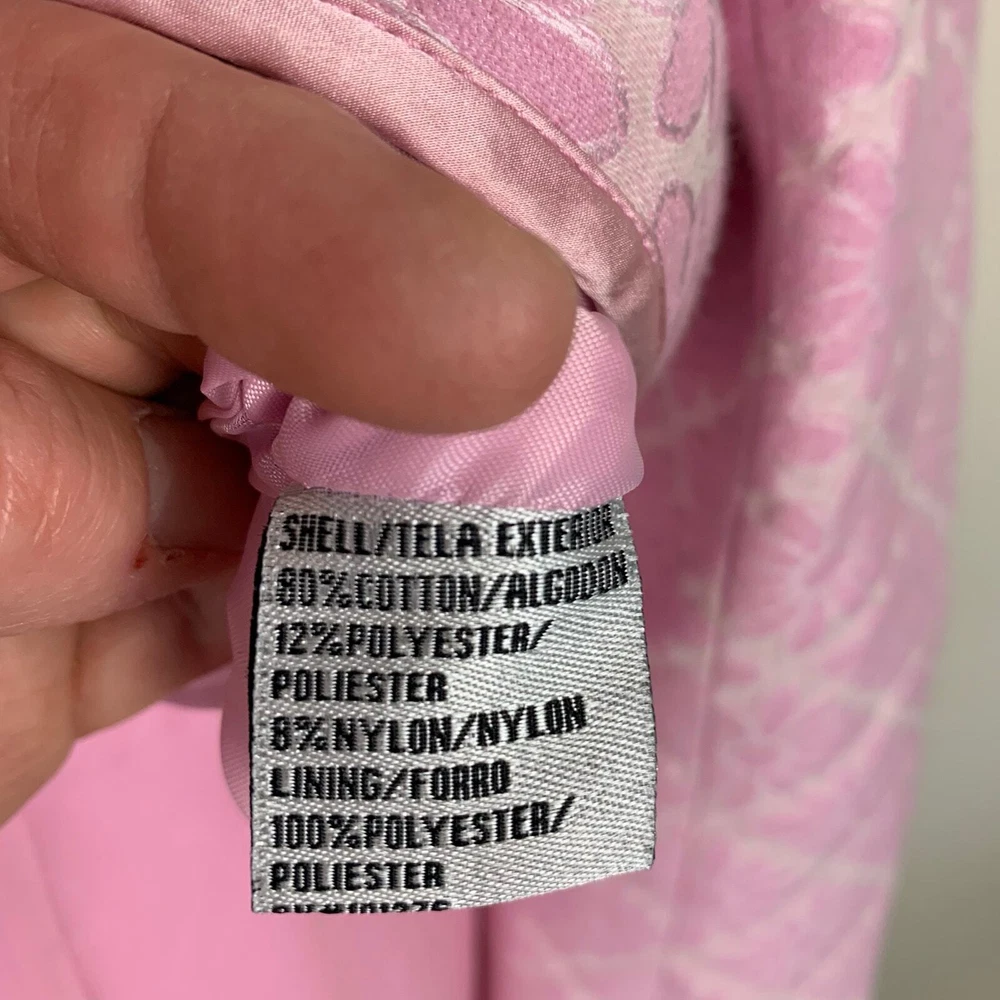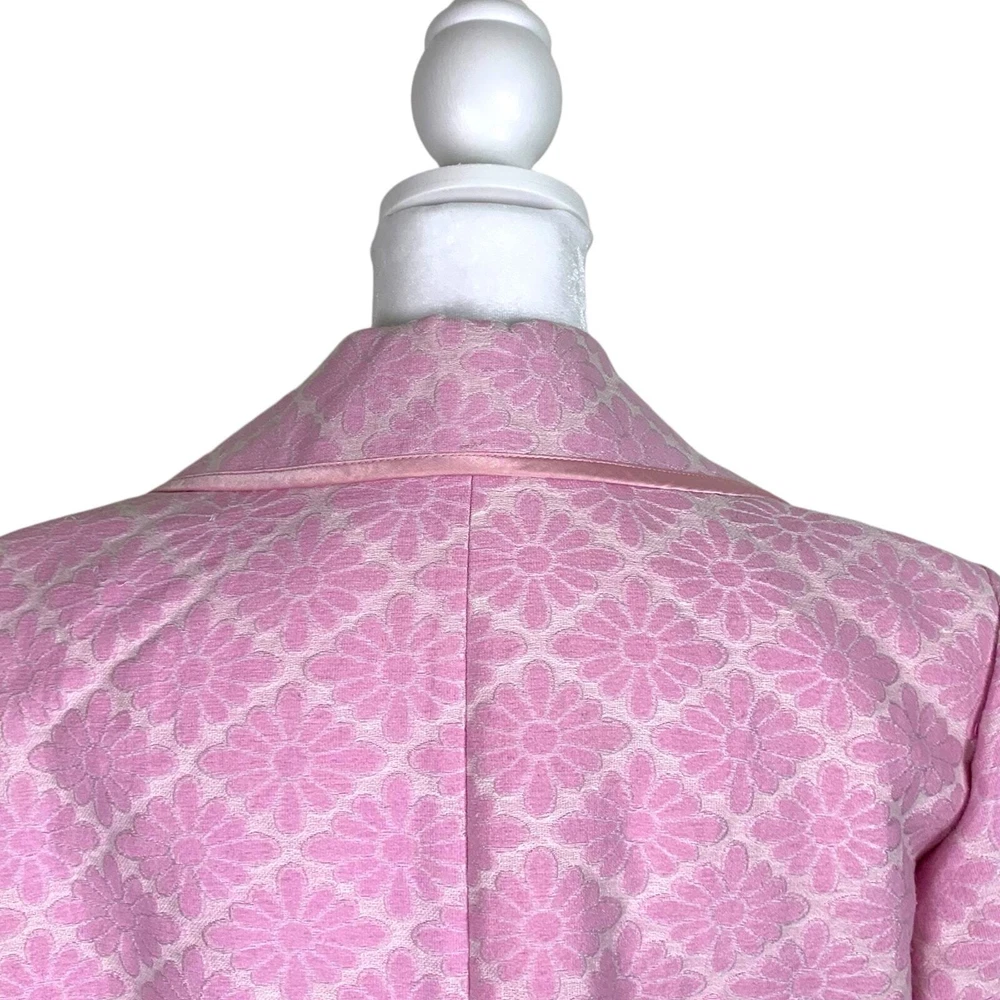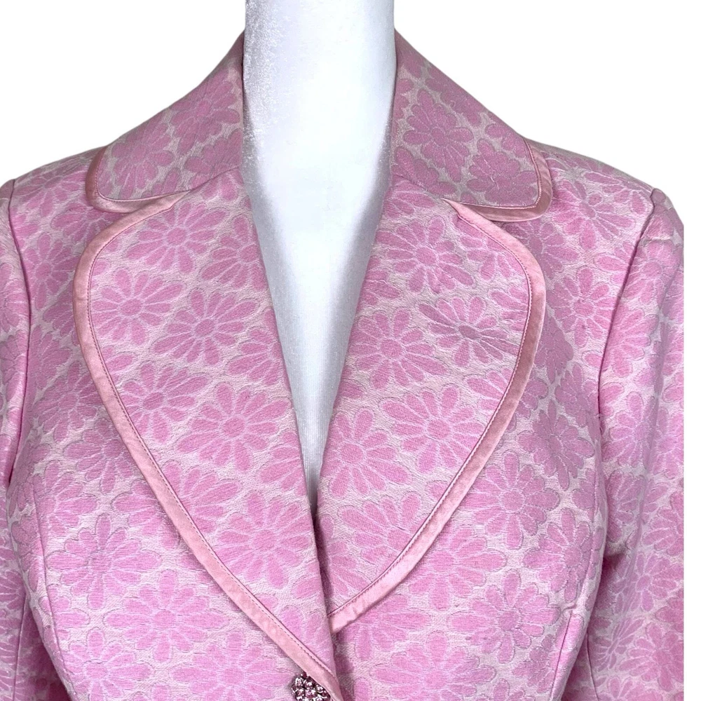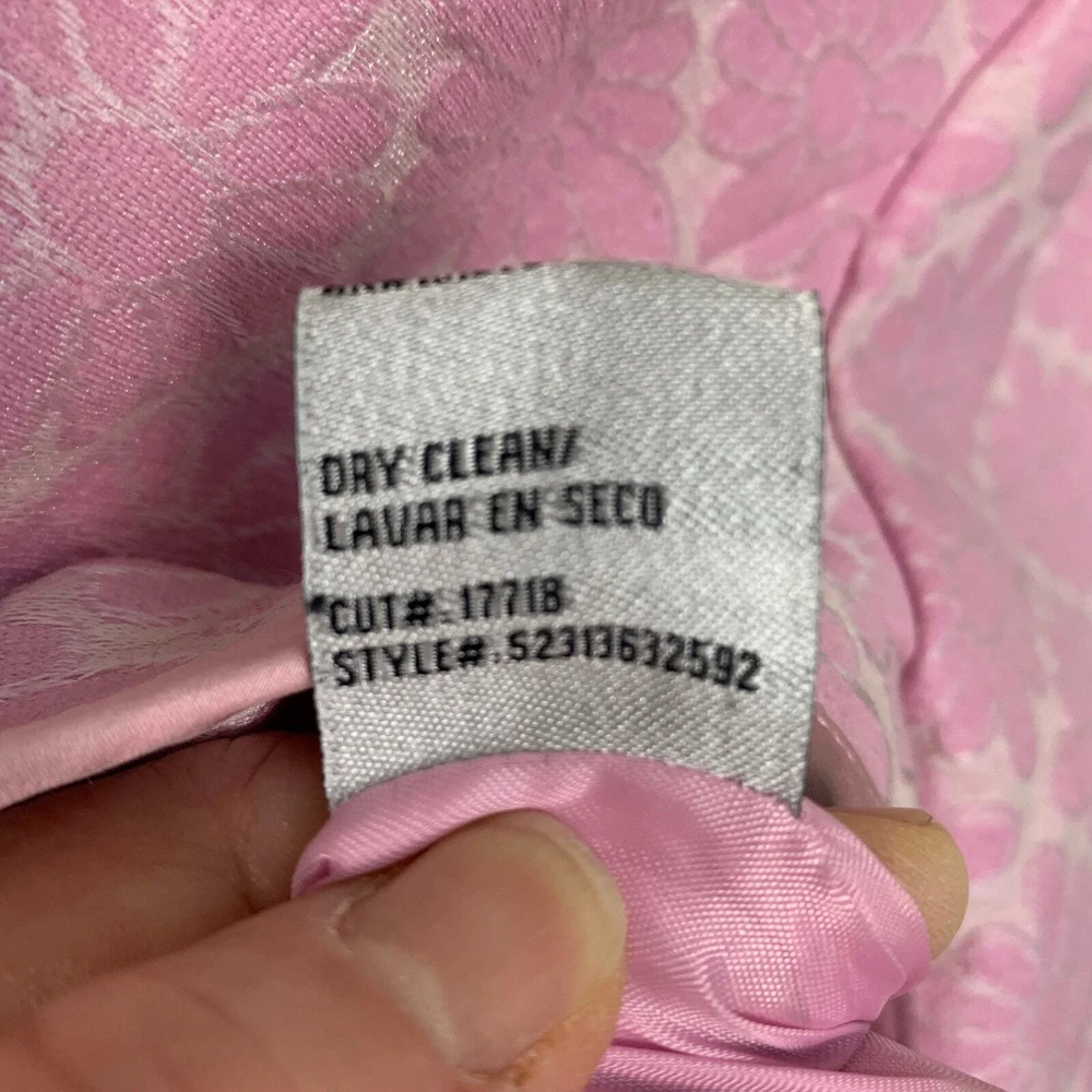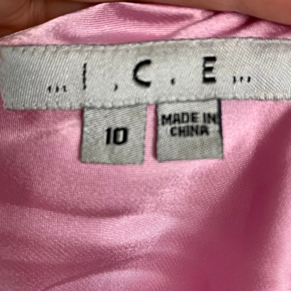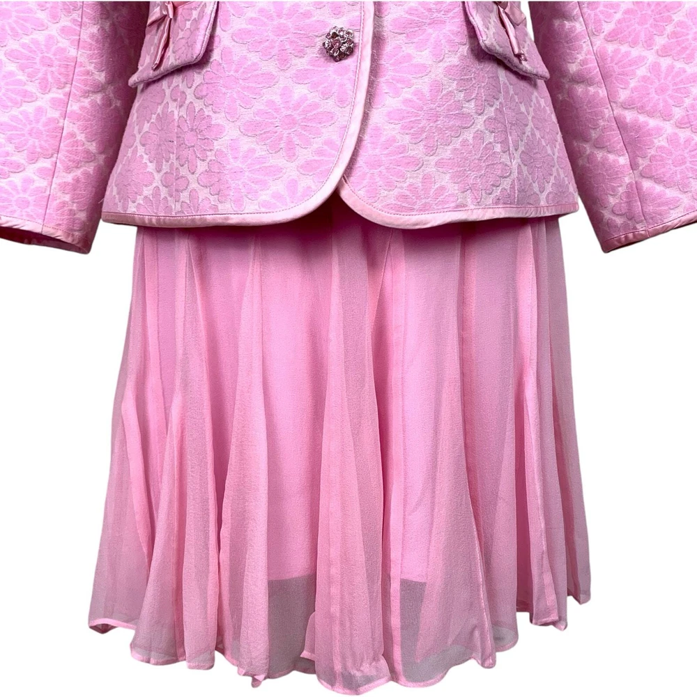 VINTAGE I.C.E. Women's Pink Brocade Jacket Sz 12 and Silk Skirt Sz 10 This is a GORGEOUS vintage suit with whimsical vibes. The Jacket (size 12) is trimmed with satin and the two front faux pockets have satin bows and is fully lined. The pink rhinestone flower buttons on the jacket add an element of pizazz!! The skirt is 100% silk, fully lined knife pleated and flowy. It has a side zipper closure. The skirt is a size 10. While the jacket and skirt are meant to be worn as a set, these two pieces will also compliment many other items in your closet for some fun stylish looks. The vintage pieces are in EXCELLENT Vintage Condition - please see all pictures. Please see all measurements below for exact sizing. Measurements: (flat lay) Jacket (measured buttoned closed) Chest (pit to pit): 20.5" Sleeve (shoulder to hem of sleeve): 20" Length (shoulder to hem of jacket): 21.5" Skirt: Waist: 16.75" Length (waistband to hem of skirt): 20.5" Materials: Jacket: Shell: 80% Cotton, 12% Polyester, 8% Nylon Lining: 100% Polyester Skirt: Shell: 100% Silk Lining: 100% Polyester Care: Dry Clean FAST SHIPPING Smoke Free Home Please reach out with any questions - I am always happy to answer!!