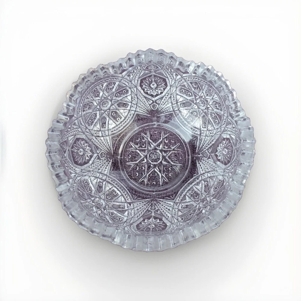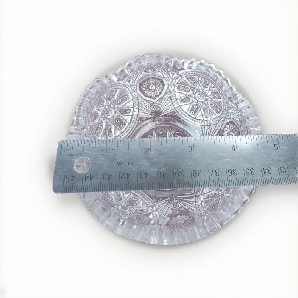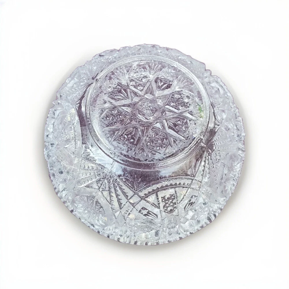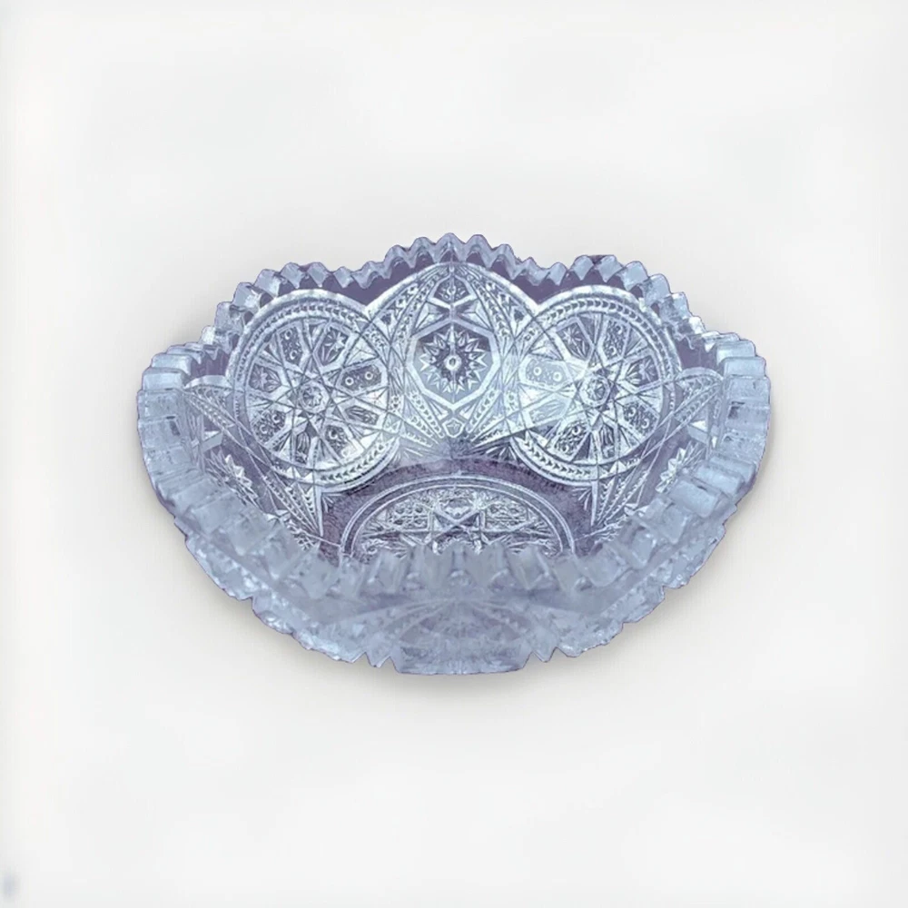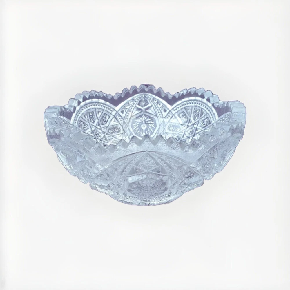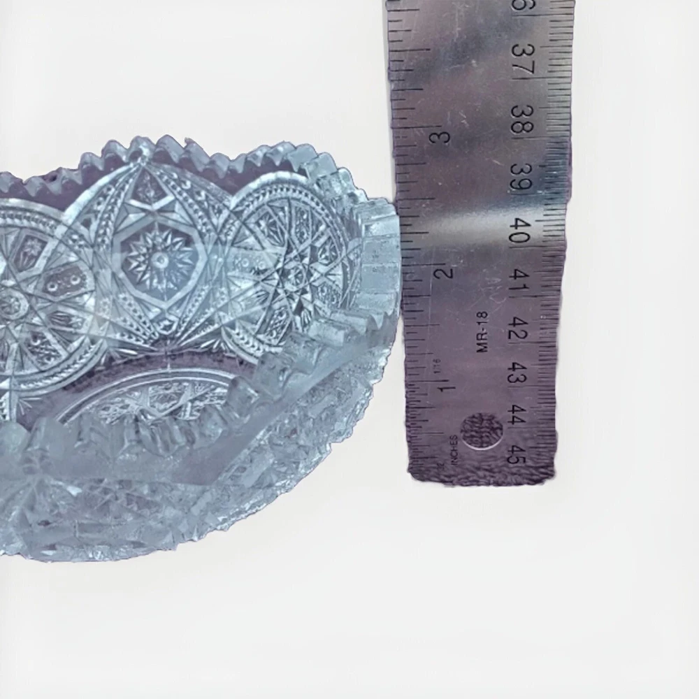 This is a vintage Imperial Glass dessert bowl in the American Brilliant pattern. It is made of glass and measures 4.75 x 2 inches. The set includes one bowl, featuring a production style of cut glass.