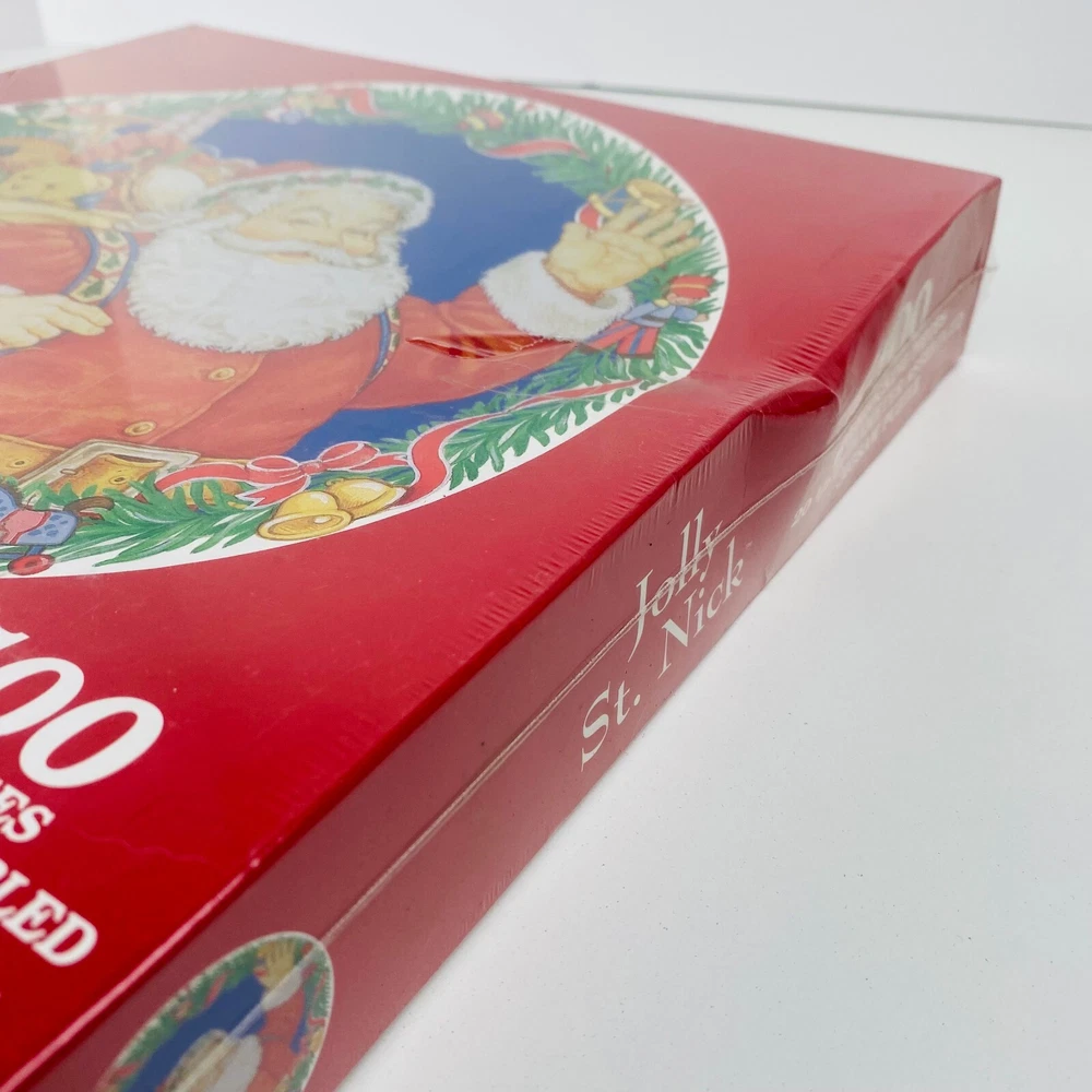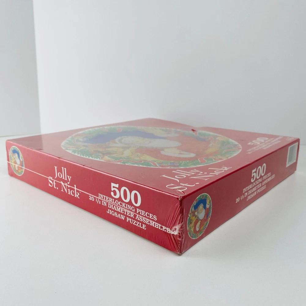 VINTAGE JOLLY ST. NICK BY GIBSON 500 PC ROUND JIGSAW PUZZLE New Good Condition Factory Sealed with tear on plastic. Box Bent as shown in photo 500 Interlocking Pieces 20 1/2 inch Diameter