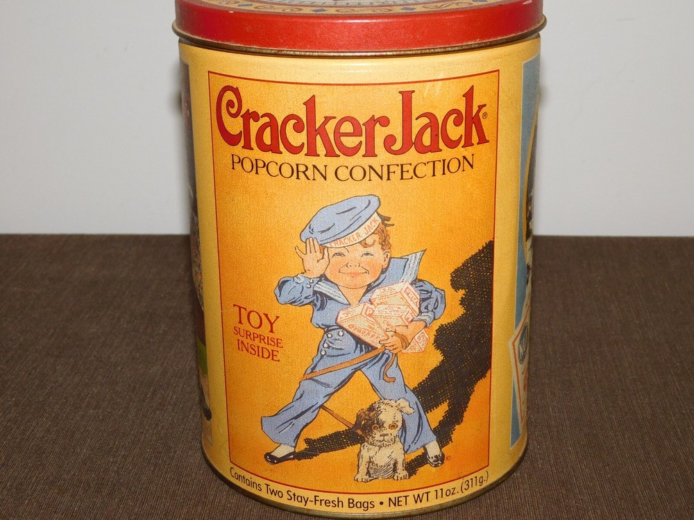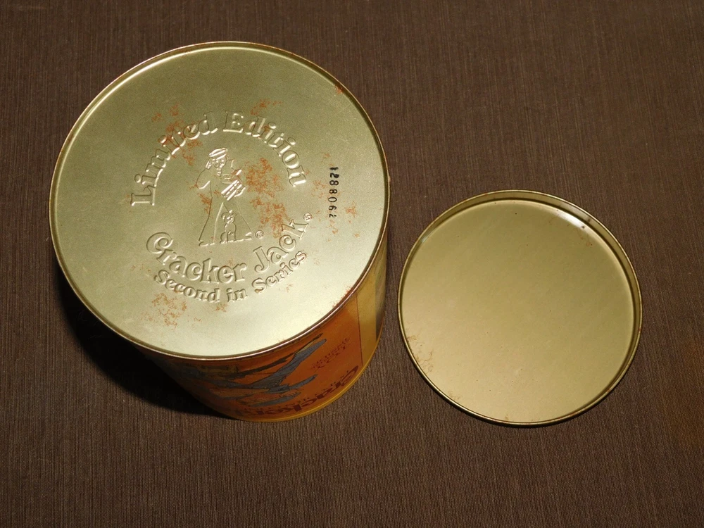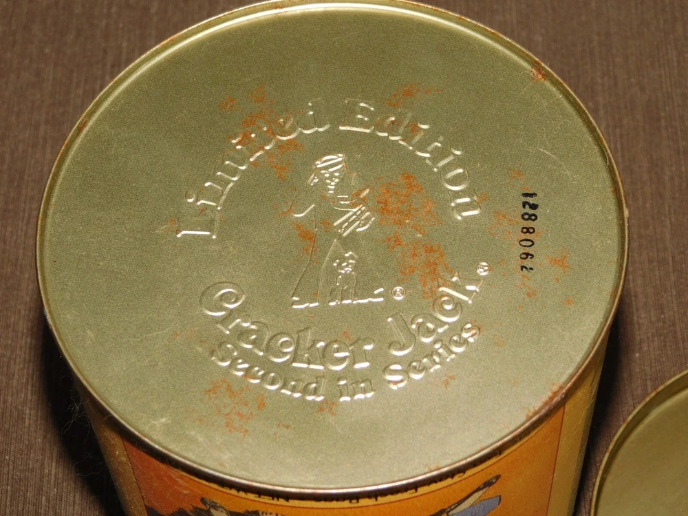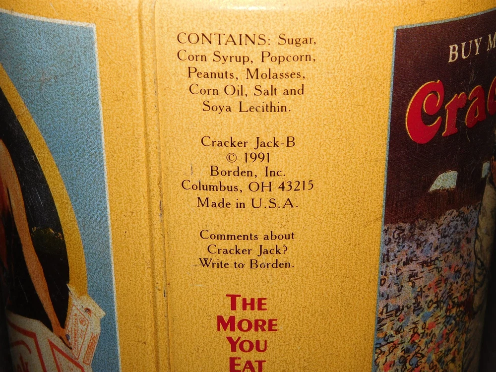 YOU ARE BIDDING ON..... VINTAGE KITCHEN 1991 8" HIGH CRACKER JACK POPCORN TIN CAN *EMPTY* ..SHOWS HANDLING/AGE WEAR..HAS SCRATCHES/PAINT LOSS/STAINS/AGE DISCOLORATION ... PLEASE VIEW PHOTOS FOR CONDITION.***PLEASE E-MAIL IF YOU HAVE A QUESTION OR WANT AN ADDITIONAL PICTURE....PLEASE VISIT MY EBAY STORE FOR ADDITIONAL VINTAGE ITEMS..THANK YOU***8VBX1330 PLSBG
