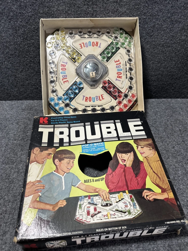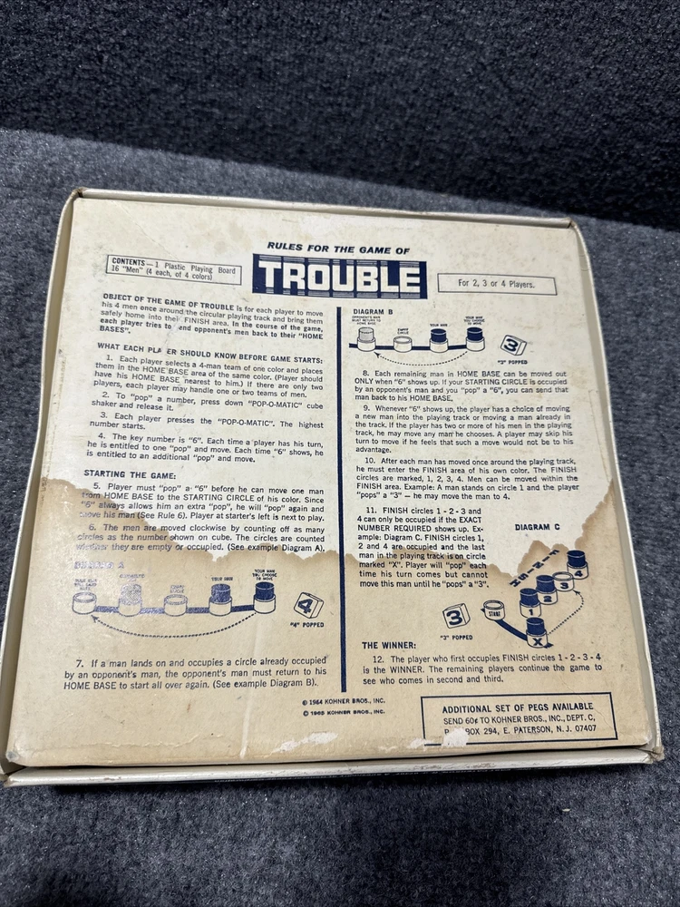 This vintage board game from Kohner Bros. Inc. is a true collector's item. The game title is Trouble and it features the iconic Pop-O-Matic dice roller. The game was released in 1965 and has a classic theme that will bring back fond memories for many. This board game is in good working condition and still pops like new. The brand name Kohner Bros. Inc. is synonymous with quality and this board game is no exception. Add this classic vintage game to your collection today! No game pieces, just board and box