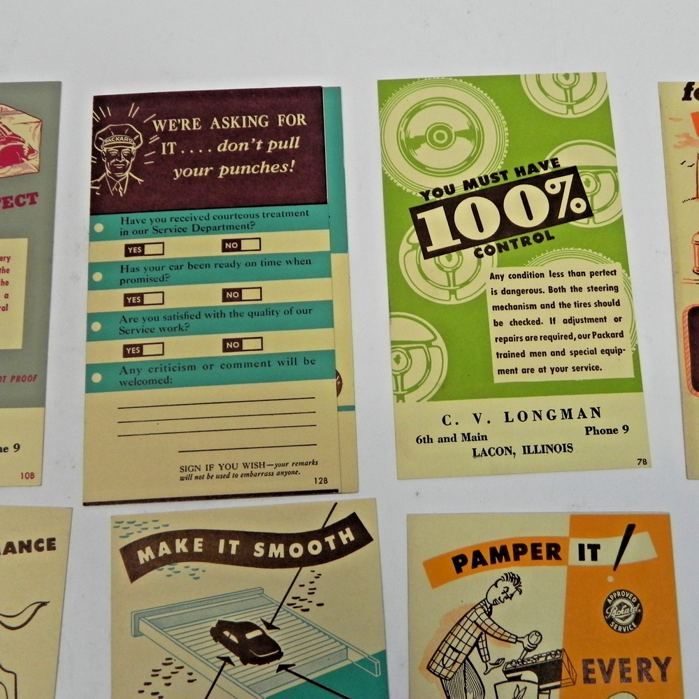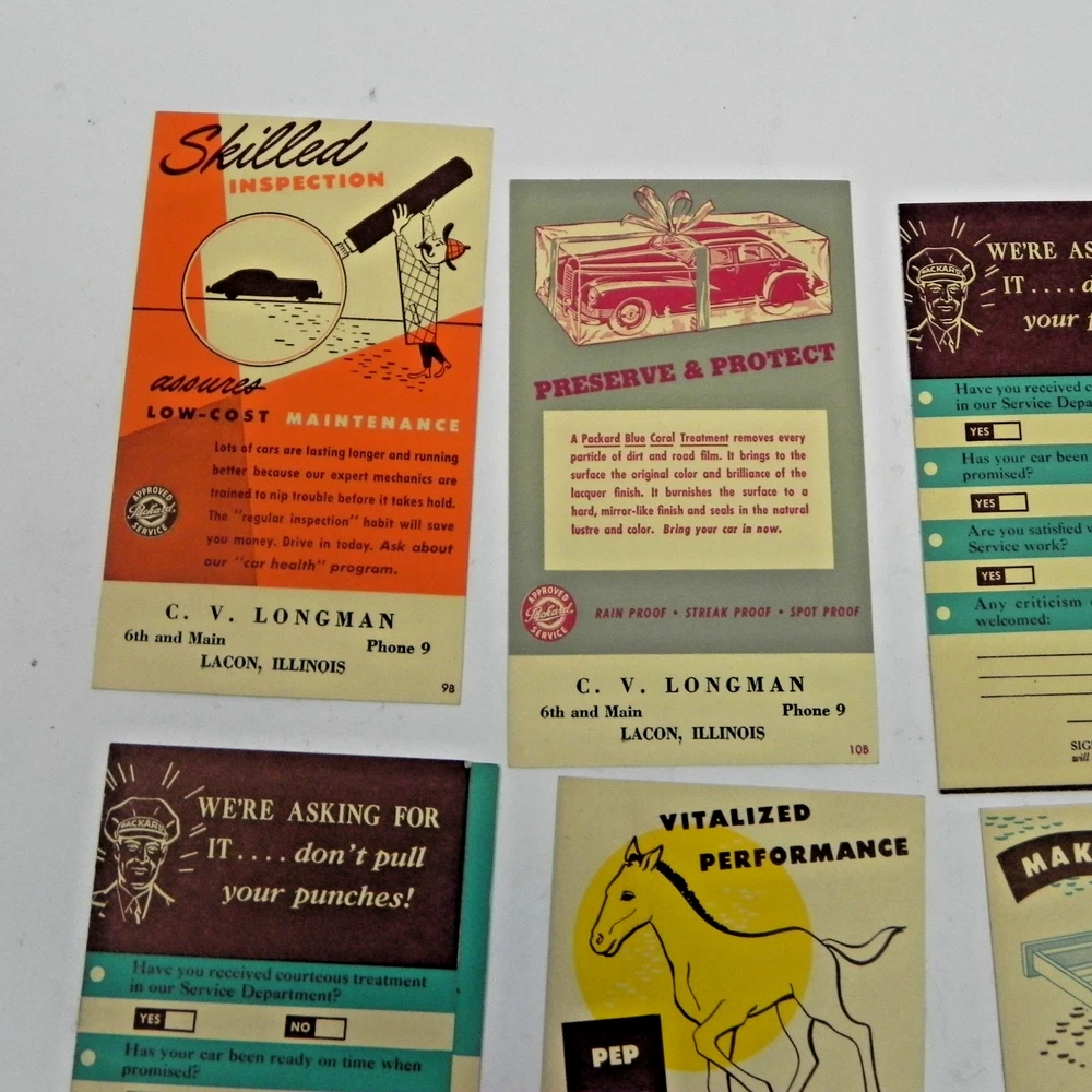 This product is a lot of rare vintage postcards from Packard cars dealerships in the 1930s and 1940s. These collectible items provide a unique glimpse into the transportation and automotive industry during that period, making them highly sought after by enthusiasts and collectors. With images showcasing various Packard cars and the dealerships where they were sold, these postcards offer a classic touch of nostalgia for those who appreciate vintage automobile memorabilia.