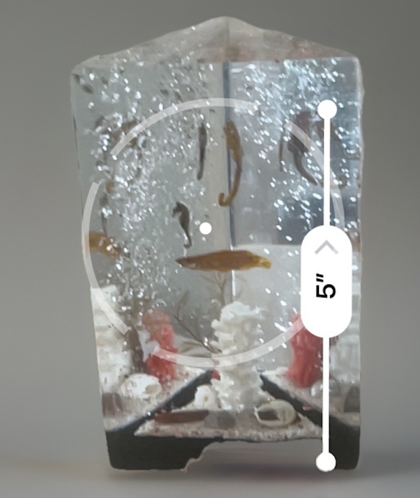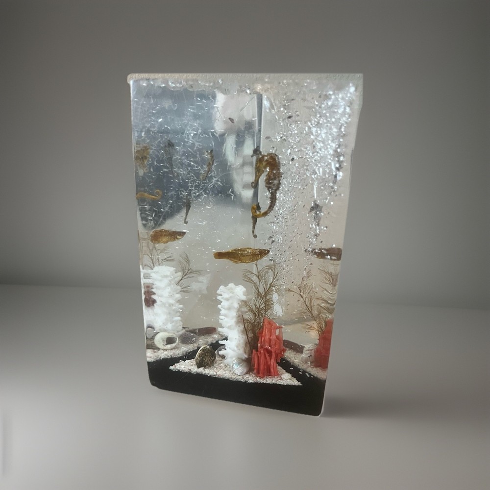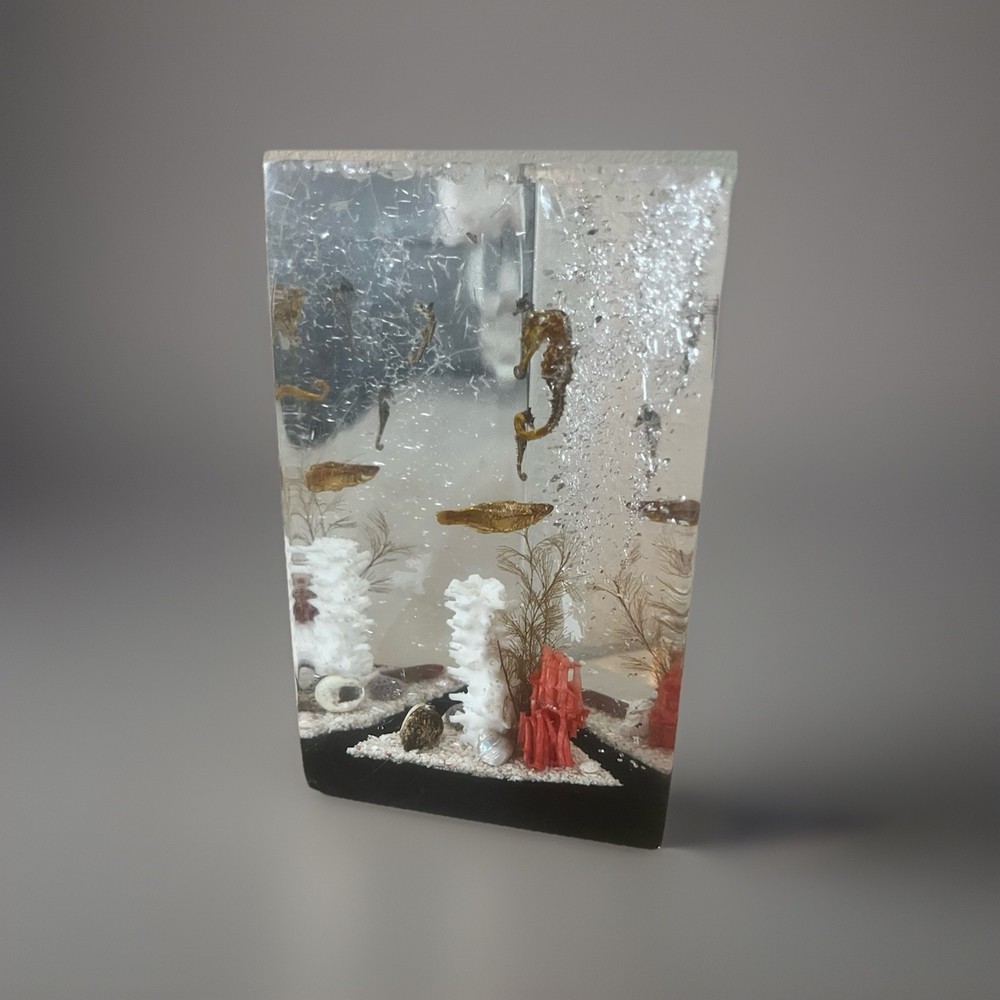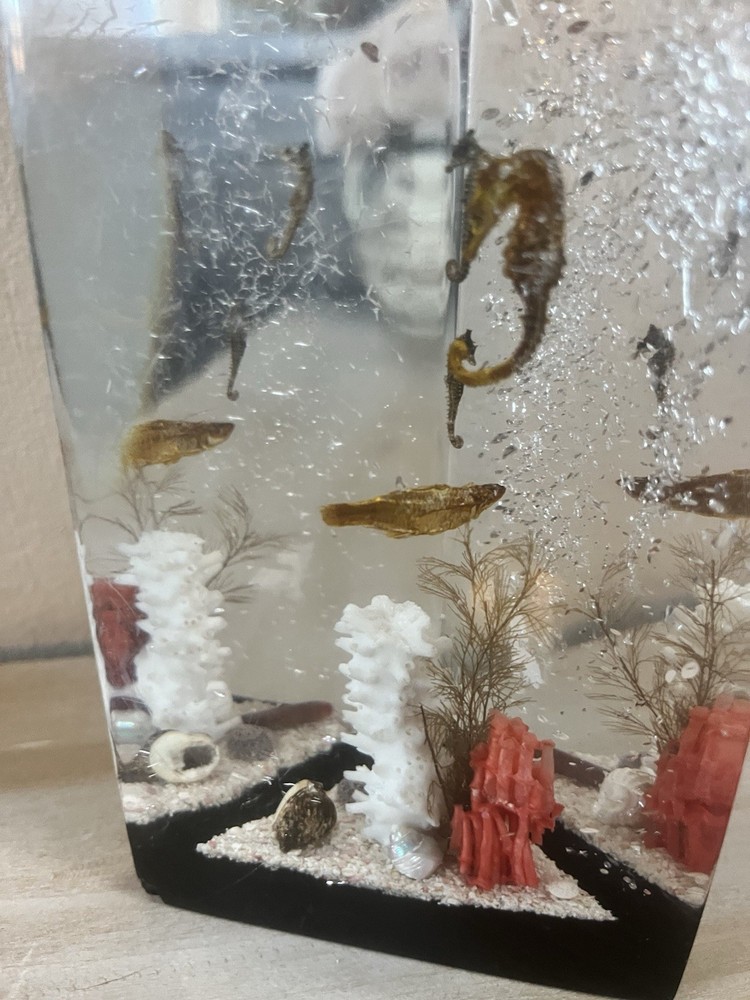 VINTAGE LUCITE OCEAN BEACH DECOR DIORAMA WITH SHELLS & SEA FISH HORSES