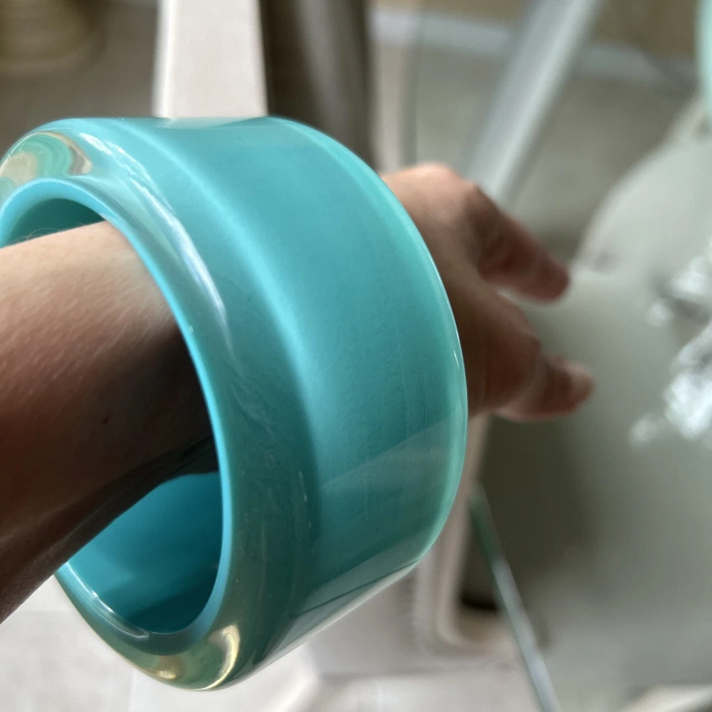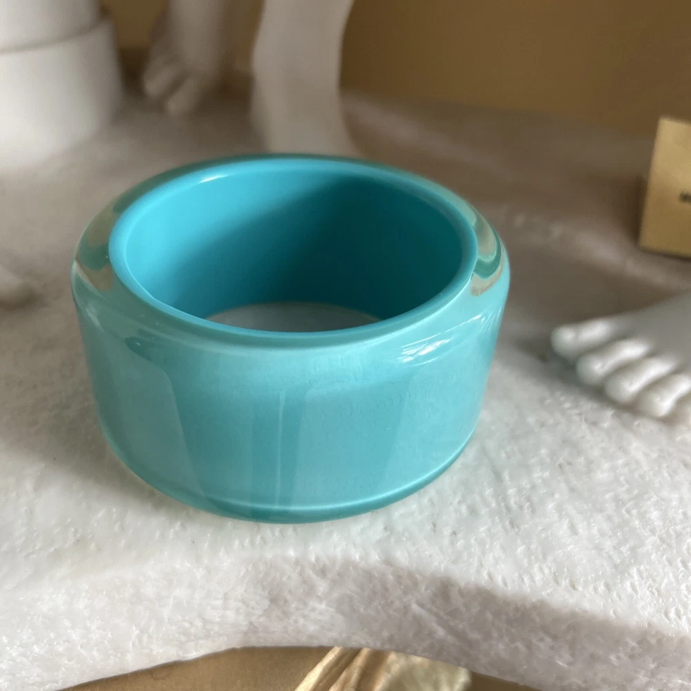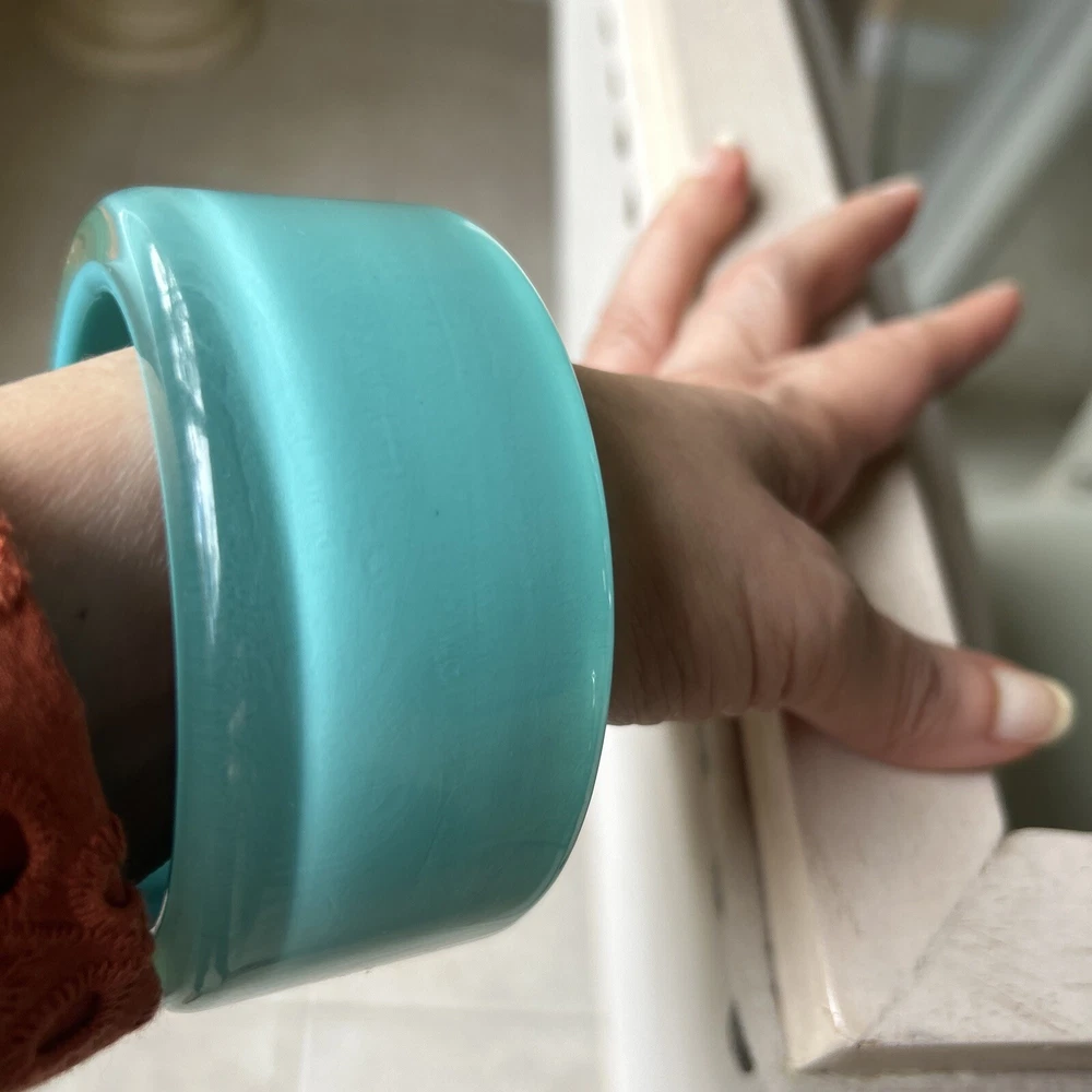 A VINTAGE LUCITE RUNWAY STATEMENT BANGLE DONE IN A GORGEOUS TIFFANY BLUE COLOR , THE BANGLE IS A TRUE STATEMENT PIECE! WELL CARED FOR CONDITION.