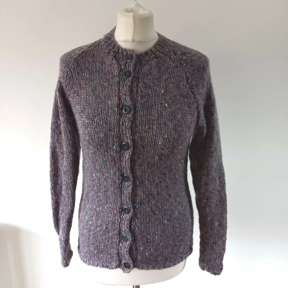 Gently used vintage condition with no faults found. Cardigan in a soft yarn with purple as main colour but also other colours running through it. Higher neck. Measures 18" pit to pit, 16" across hip area approx, , length nape to hem 25" with a bit of roll up at the hem, sleeve 24". Unsure of yarn content but is soft and has some mohair in it.