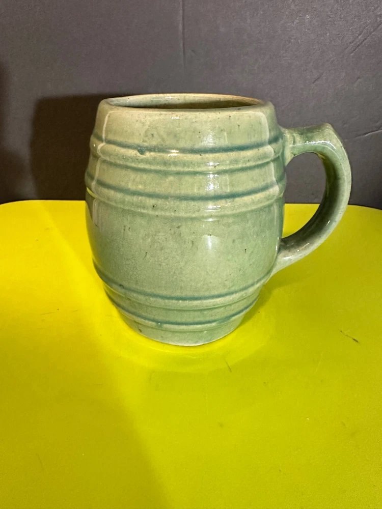 This vintage McCoy green #16 stoneware barrel mug is a unique addition to any collection. With its classic design and durable material, this mug is perfect for both decorative and functional use. The brand, McCoy, is well-known for their quality pottery and this vintage original is no exception. The mug's color is a beautiful shade of green and it features the iconic McCoy logo. Its year of manufacture is 1920, making it a rare find for collectors. This mug is perfect for anyone who appreciates vintage pottery or who wants to add a touch of history to their collection.