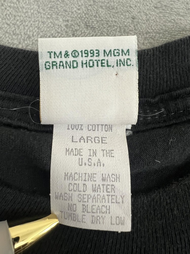 Brand/Subject: MGM Grand Las Vegas Tag info: TM & ©1993 MGM Grand Hotel, Inc. Material: 100% Cotton Made in U.S.A. Size: Large (Mens) Color: Black with teal and gold graphic Design: Large front graphic of the MGM Grand lion with stylized skyline; text reads "MGM GRAND LAS VEGAS." Style: Short sleeve crewneck shirt Era: 1993 (90s vintage) Labels: "Made exclusively by MGM Grand" neck label present Care tag (visible text): Machine wash cold water; wash separately; no bleach; tumble dry low Notes: Measurement tools shown in photos for reference only.