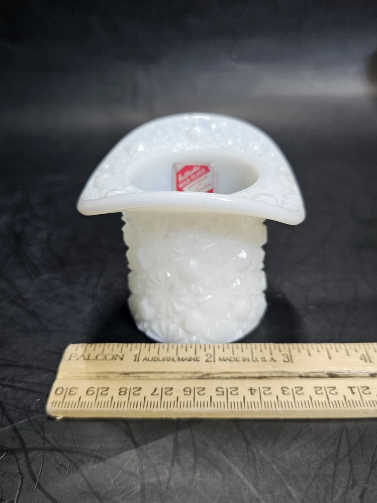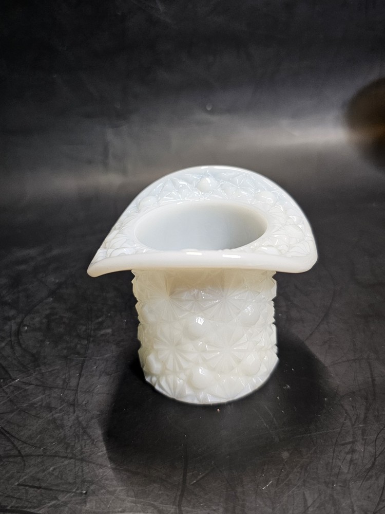 In excellent condition This Vintage Mid Century Fenton Milk Glass Top Hat Daisy Dot Toothpick Holder is a charming piece of decorative pottery and glassware originating from North America. The elegant design features a classic daisy and dots pattern on white milk glass, with a whimsical nod to the subject of a top hat. This vintage original piece from the Fenton brand captures the essence of the mid-century era with its unique style and production techniques. Perfect for collectors or those looking to add a touch of nostalgia to their home decor.