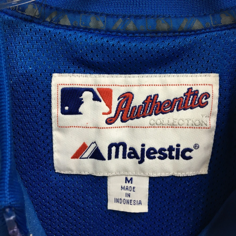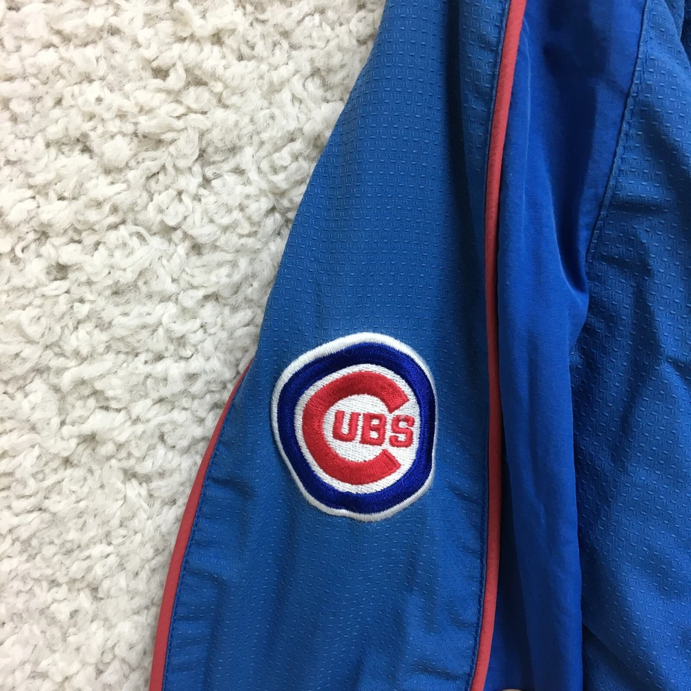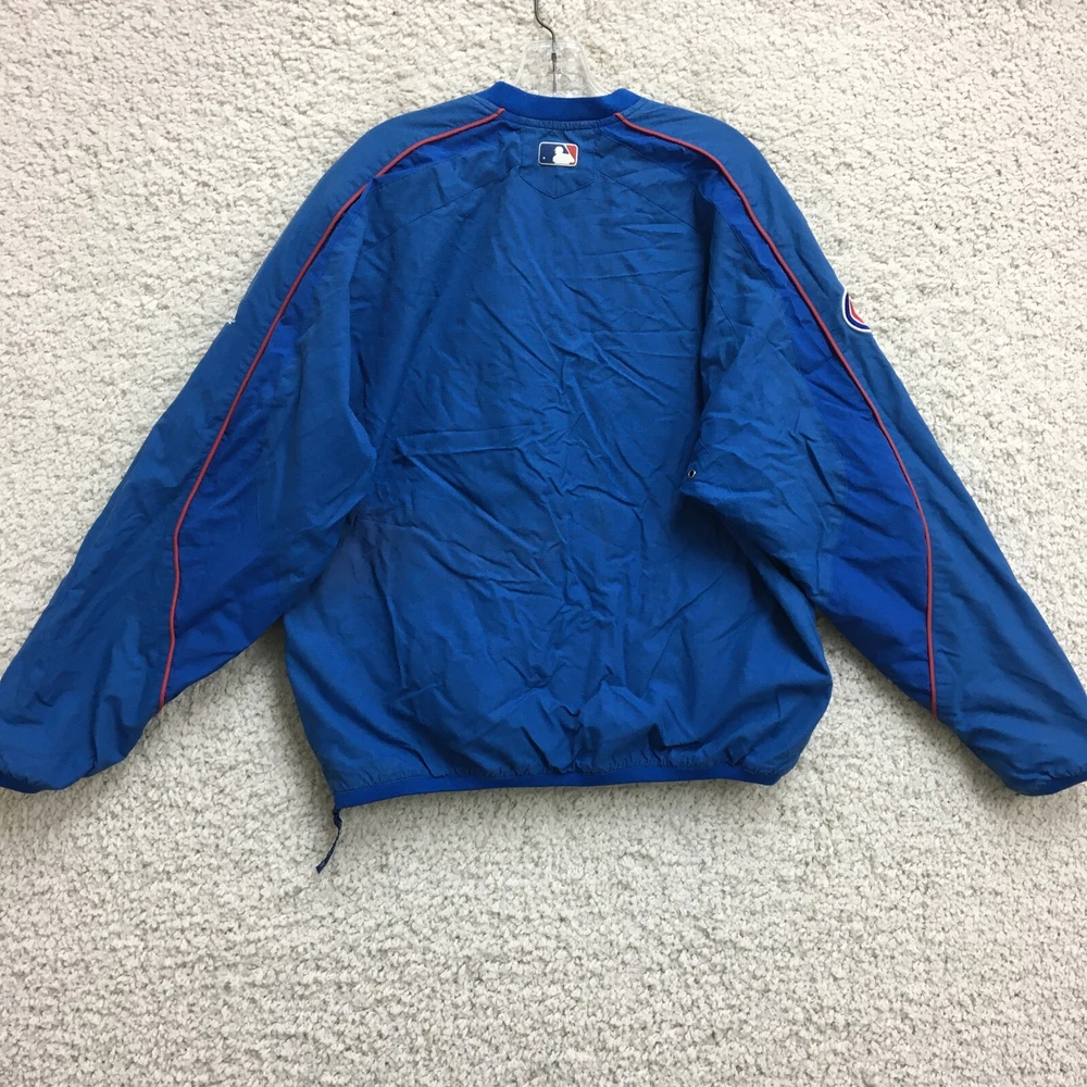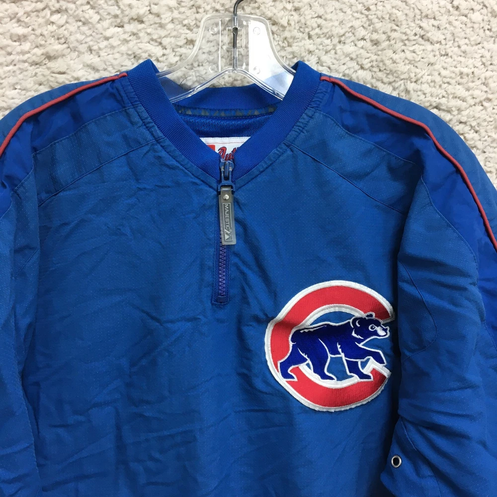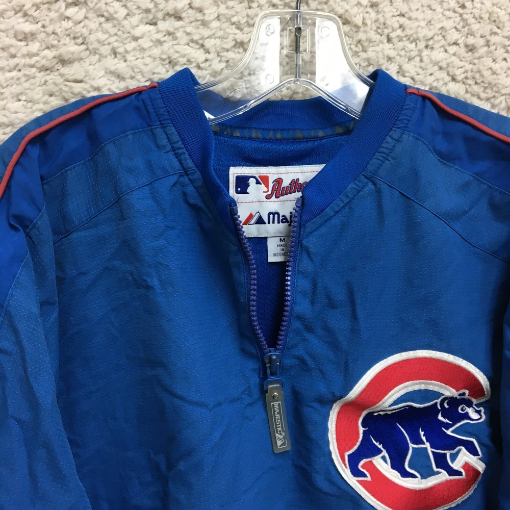 Product: Jacket Brand: Majestic Team: Chicago Cubs Seller Notes: “Faded on the back. Good Used Condition. Please, See Pictures for Full Condition and Measurements.” Sport: Baseball UPC: Does not apply Size: M Color: Blue League: Major League (MLB) Country/Region of Manufacture: Indonesia Gender: Men Pre & Post Season: Regular Season Officially Licensed: Yes gtin13: Does not apply