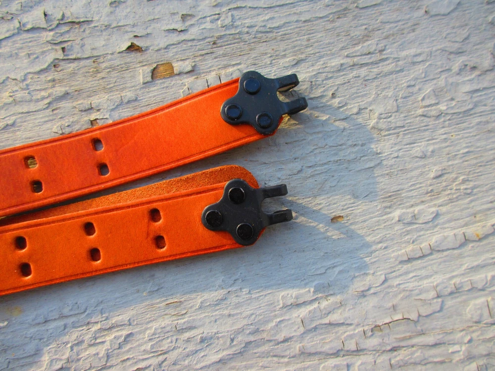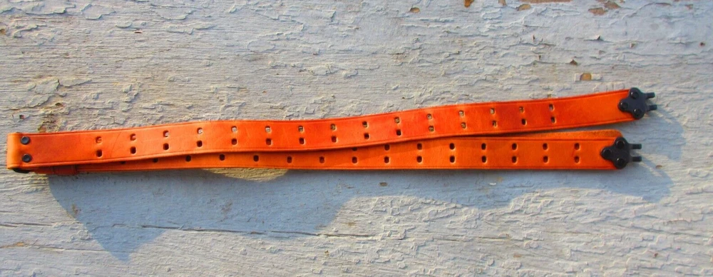 This vintage leather military-style sling is perfect for shotguns and rifles. Made with high-quality leather, it features adjustable straps for a comfortable and secure fit. The sling is designed for M-1 Grand Style guns and is extra heavy-duty, making it suitable for hunting and other outdoor activities. This has not been used. Leather is soft and supple. Over 30+ years old. Clean Width approx, 1 1/4" wide. No returns. Buying as is condition