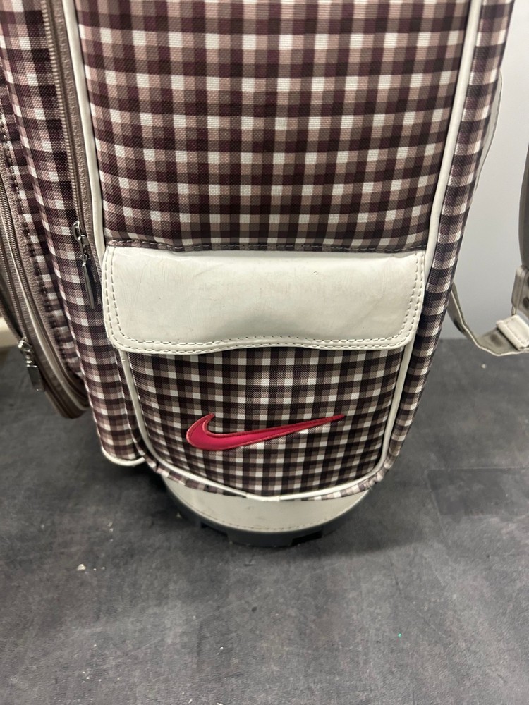 The Vintage Nike Designer Brassie Women's Cart Golf Bag is a stylish and functional accessory for female golfers. With a classic plaid design and the iconic Nike branding, this 10-way cart bag offers ample storage for golf clubs and equipment. Its sturdy construction and sleek silhouette make it a fashionable choice for any golf enthusiast looking for both quality and style on the course.