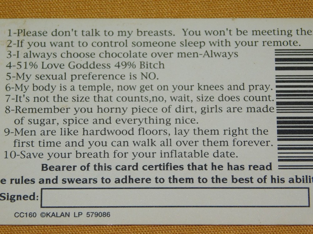 YOU ARE BIDDING ON...... . . VINTAGE NOVELTY GAG GIFT COOL MEN PLEASE READ RULES BEFORE PROCEEDING CARD.. .. .. ..PLASTIC.... MEASURES APPROX 3 3/8" X 2 1/8"........ SHOWS SOME HANDLING/ AGE WEAR..........PLEASE VIEW PHOTOS FOR CONDITION.***PLEASE E-MAIL IF YOU HAVE A QUESTION OR WANT AN ADDITIONAL PICTURE....PLEASE VISIT MY EBAY STORE FOR ADDITIONAL VINTAGE ITEMS..THANK YOU*** 12P-8765-XXXX