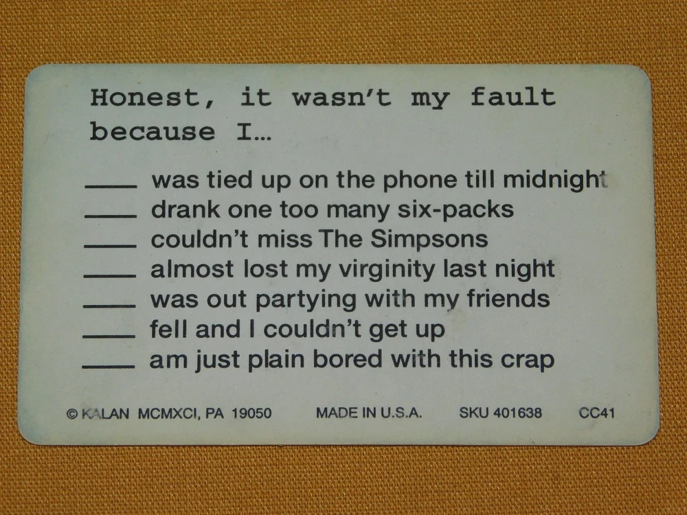 YOU ARE BIDDING ON...... . . VINTAGE NOVELTY GAG GIFT COOL STUFF OFFICIAL HOMEWORK EXCUSE CARD .. .. ..PLASTIC.... MEASURES APPROX 3 3/8" X 2 1/8"........ SHOWS SOME HANDLING/ AGE WEAR..........PLEASE VIEW PHOTOS FOR CONDITION.***PLEASE E-MAIL IF YOU HAVE A QUESTION OR WANT AN ADDITIONAL PICTURE....PLEASE VISIT MY EBAY STORE FOR ADDITIONAL VINTAGE ITEMS..THANK YOU*** 12P-8765-XXXX