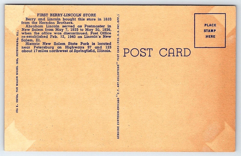 VINTAGE OLD ANTIQUE POSTCARD BERRY LINCOLN STORE POST OFFICE NEW SALEM ILLINOIS