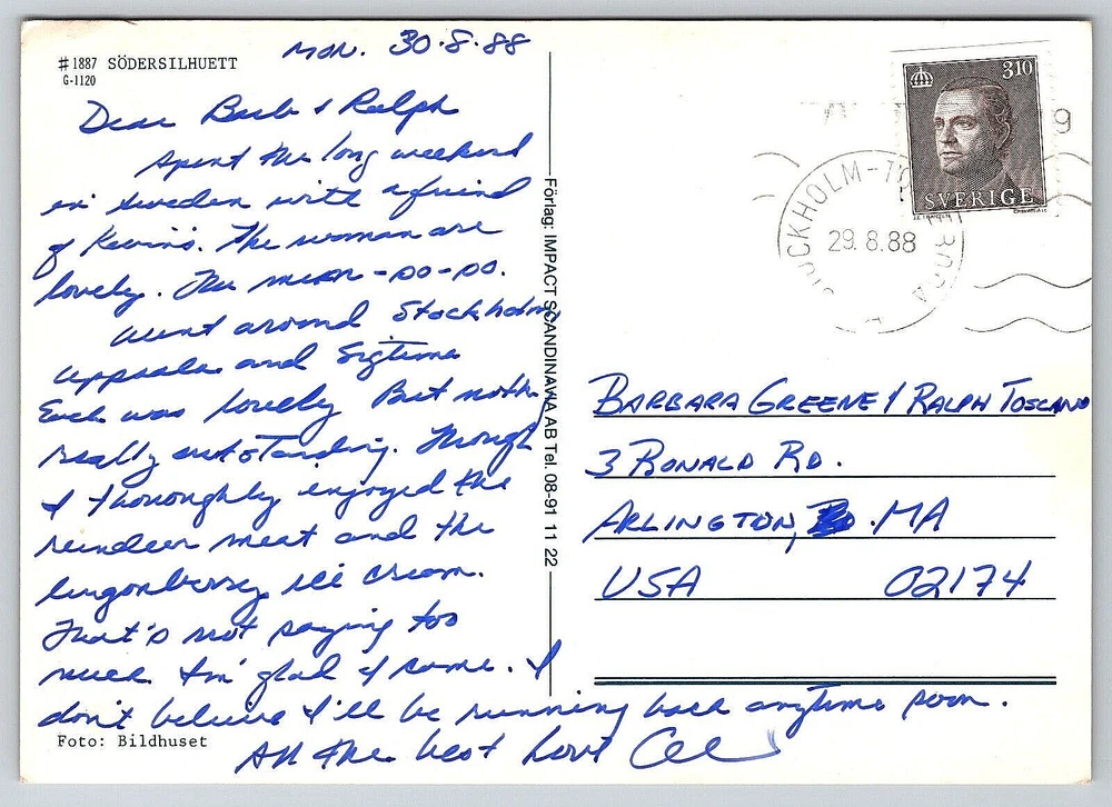 Featured Person: None Vintage: Yes Subject: Bridge Size: Continental (6 x 4 in) Antique: Yes Country: Sweden Country/Region of Manufacture: Sweden Era: Divided Back (1907-1915) Unit of Sale: Single Unit Time Period Manufactured: 1980-1989 Seller Notes: “Good Vintage Condition. See Pictures And Description Closely For Details.” Posted: Yes Features: Divided Back, Original Genuine Antique Vintage Postcard Finish: Glossy Postage Condition: Posted Signed: Yes Occasion: Postcard Original/Licensed Reprint: Original Color: Multicolor Region: Stockholm Continent: North America Year Manufactured: 1988 Theme: Architecture, Cities & Towns, Community Life, Countries, Cultures & Ethnicities, Domestic & Family Life, Famous Places, Historical Figures, Landscapes, Nautical, Photographs, Seasons, Social History, Technology, Tourism, Transportation, Travel, Postcard, Antique, Vintage, Ephemera, Collectible, Memorabilia, Old, Retro, History, Card, Mail, Paper Stamp: Yes City: Stockholm Franchise: Postcard Type: VINTAGE OLD ANTIQUE POSTCARD Artist: Postcard gtin13: DOES NOT APPLY Orientation: Vertical Brand/Publisher: IMPACT SCANDINAVIA Number of Items in Set: 1 Location: Stockholm, Sweden UPC: DOES NOT APPLY Signed By: Sender Character: Postcard Material: Paper