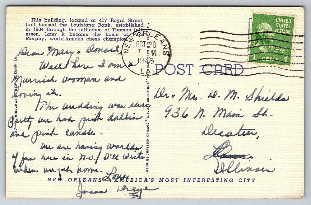 Signed: No Subject: Cities & Towns Time Period Manufactured: 1940-1949 Character: Postcard gtin13: DOES NOT APPLY Franchise: Postcard Seller Notes: “Good Vintage Condition. See Pictures And Description Closely For Details.” City: New Orleans Country: United States Region: Louisiana Country/Region of Manufacture: United States Artist: Postcard Occasion: Postcard Type: VINTAGE OLD ANTIQUE POSTCARD Featured Person: None Postage Condition: Posted Theme: Architecture, Cities & Towns, Community Life, Domestic & Family Life, Famous Places, Historical Figures, Seasons, Social History, Tourism, Postcard, Antique, Vintage, Ephemera, Collectible, Memorabilia, Old, Retro, History, Card, Mail, Paper Number of Items in Set: 1 Finish: Matte UPC: DOES NOT APPLY Stamp: Yes Unit of Sale: Single Unit Features: Divided Back, Stamp, Stamped, Original Genuine Antique Vintage Postcard Location: New Orleans, Louisiana USA Orientation: Horizontal Antique: Yes Year Manufactured: 1946 Era: Divided Back (1907-1915) Color: Multicolor Vintage: Yes Continent: North America Brand/Publisher: Curt Teich Material: Paper Posted: Yes Original/Licensed Reprint: Original Size: Standard (5.5 x 3.5 in) Signed By: None