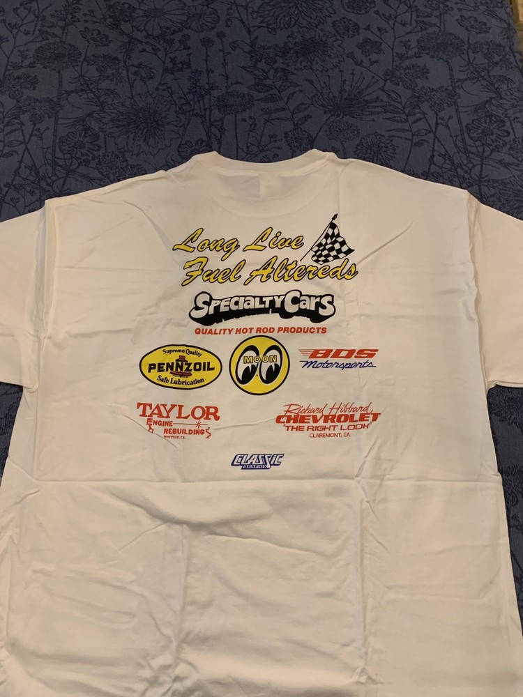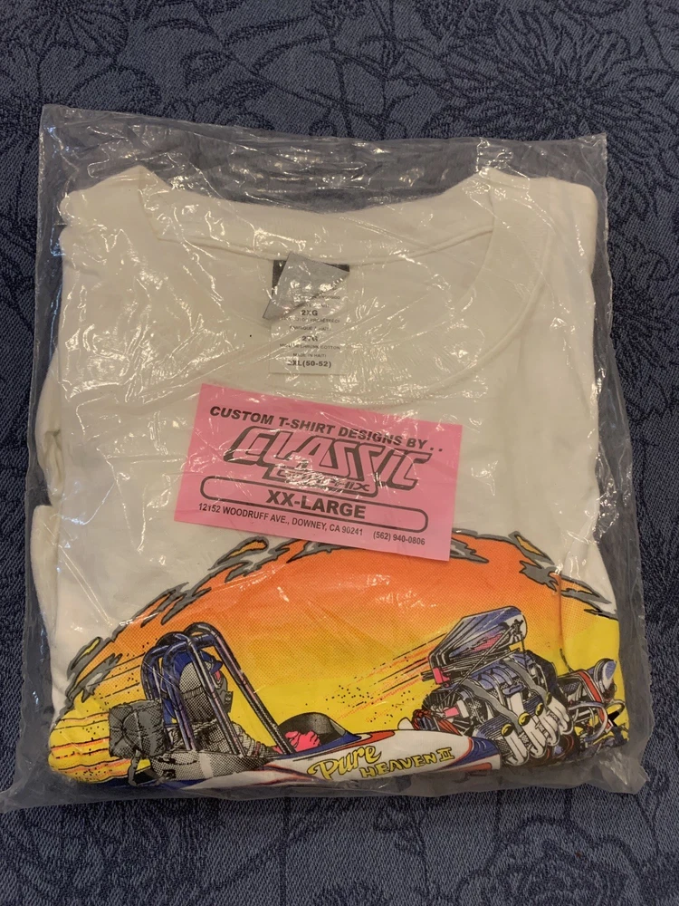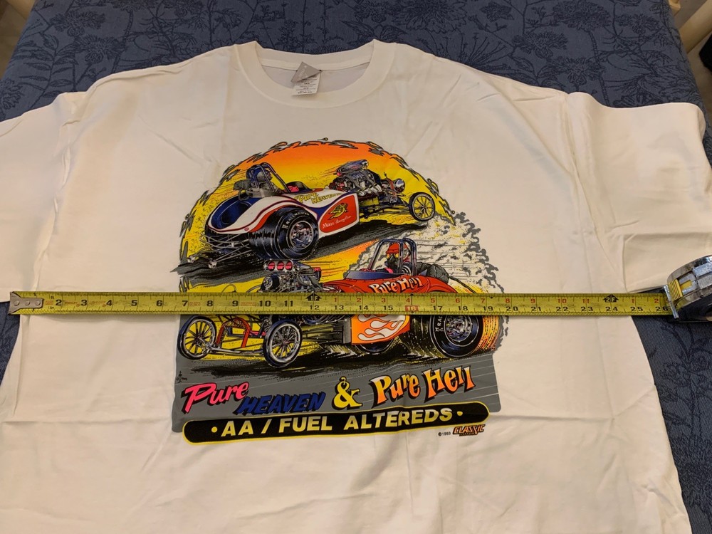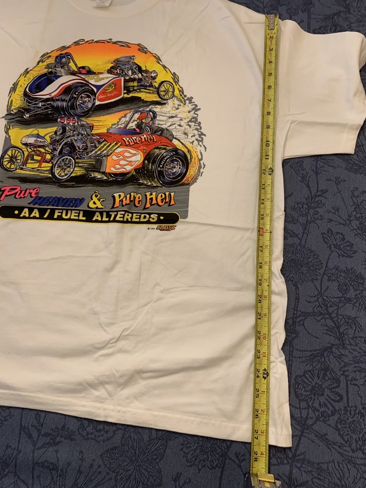 The vintage Haynes racing shirt from 1993 features a unique design of Pure Heaven Pure Hell fuel, perfect for fans of racing and those looking for a one-of-a-kind statement piece. This 2XLarge white shirt is a must-have for collectors and enthusiasts of retro racing memorabilia. Made with original materials, this shirt captures the essence of the early 90s era in the world of racing. Ship To USA only Fast shipping! Shirt was removed from packaging for pictures
