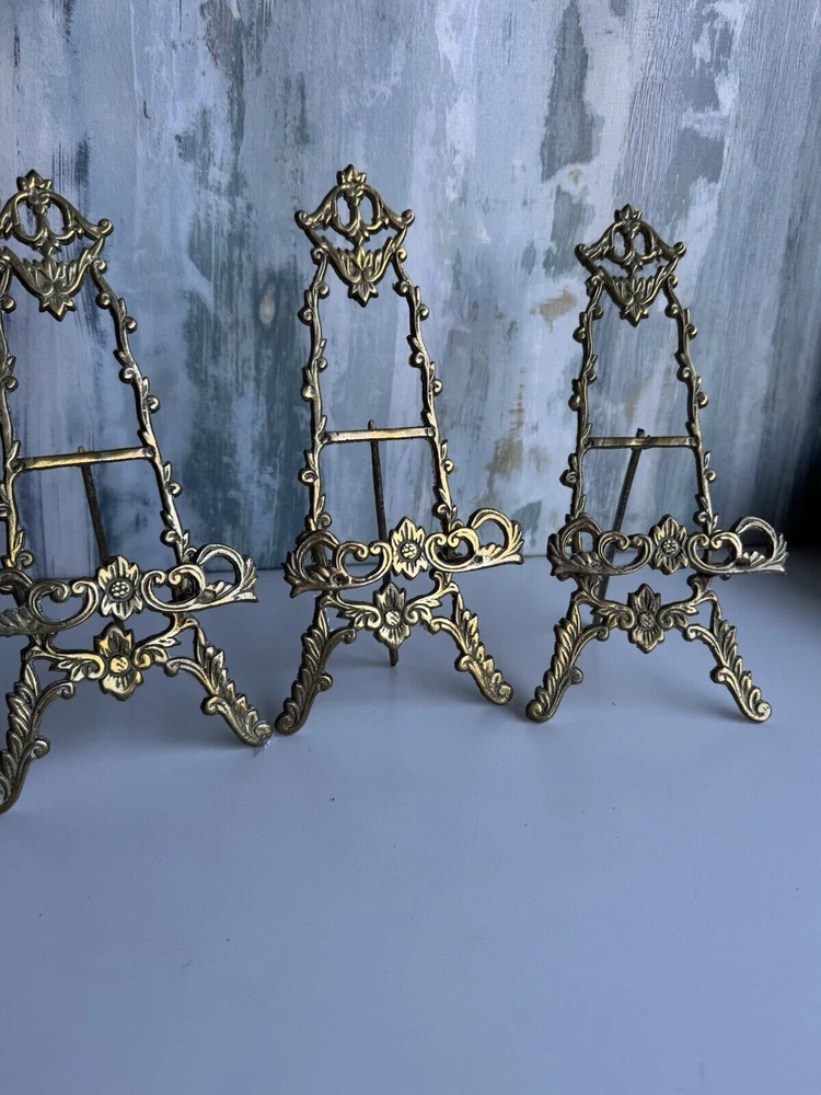 This is a vintage ornate brass easel for displaying art, pictures, plates, or tiles. It features a Victorian chic cottage style design in a gold color. The brass material adds a touch of elegance to any decor setting.aa5