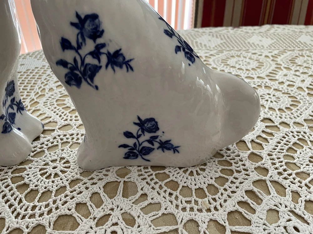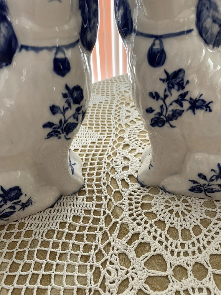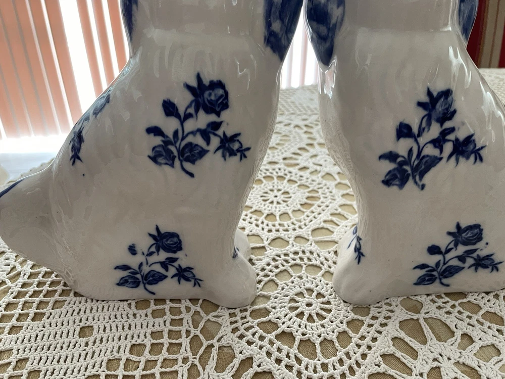 VINTAGE PAIR OF IRONSTONE STAFFORDSHIRE ENGLAND FOO DOGS IN WHITE AND BLUE