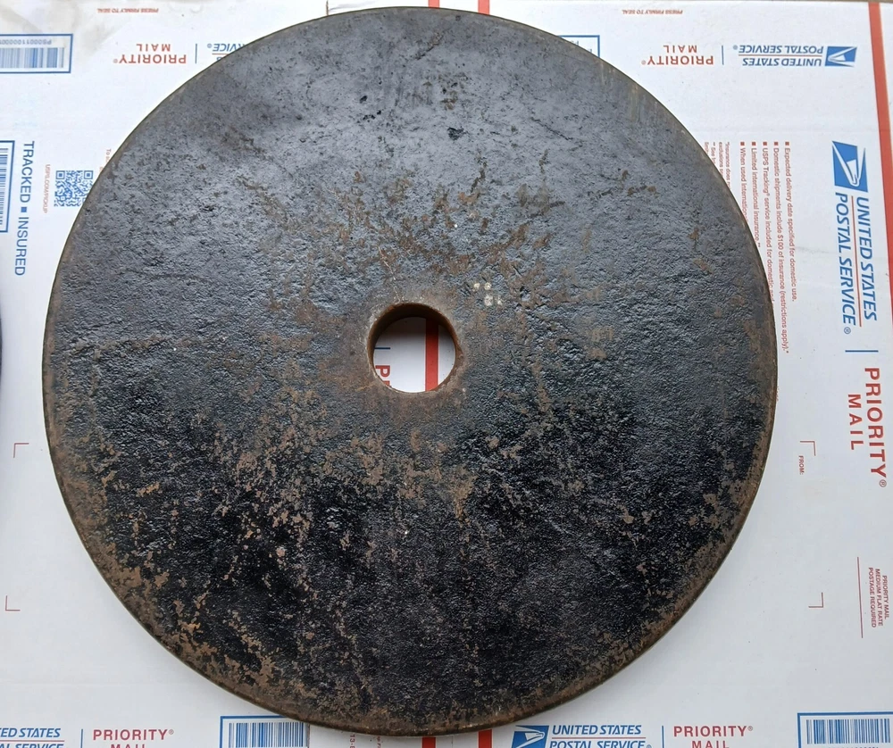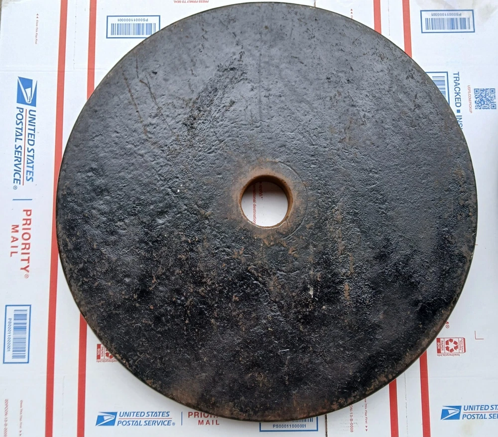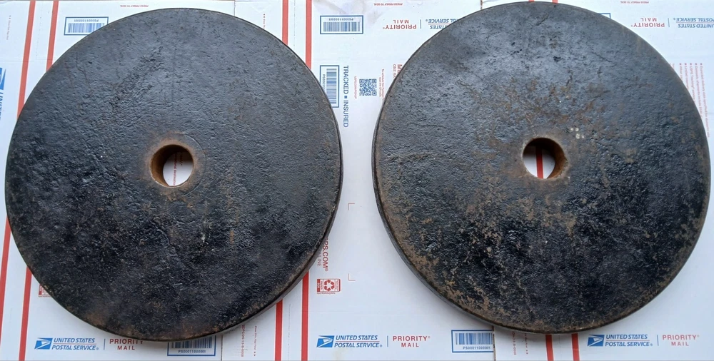 VINTAGE PAIR YORK DEEP DISH OLYMPIC 45 LB WEIGHT PLATES *ONE HAS A CHIPPED HUB*