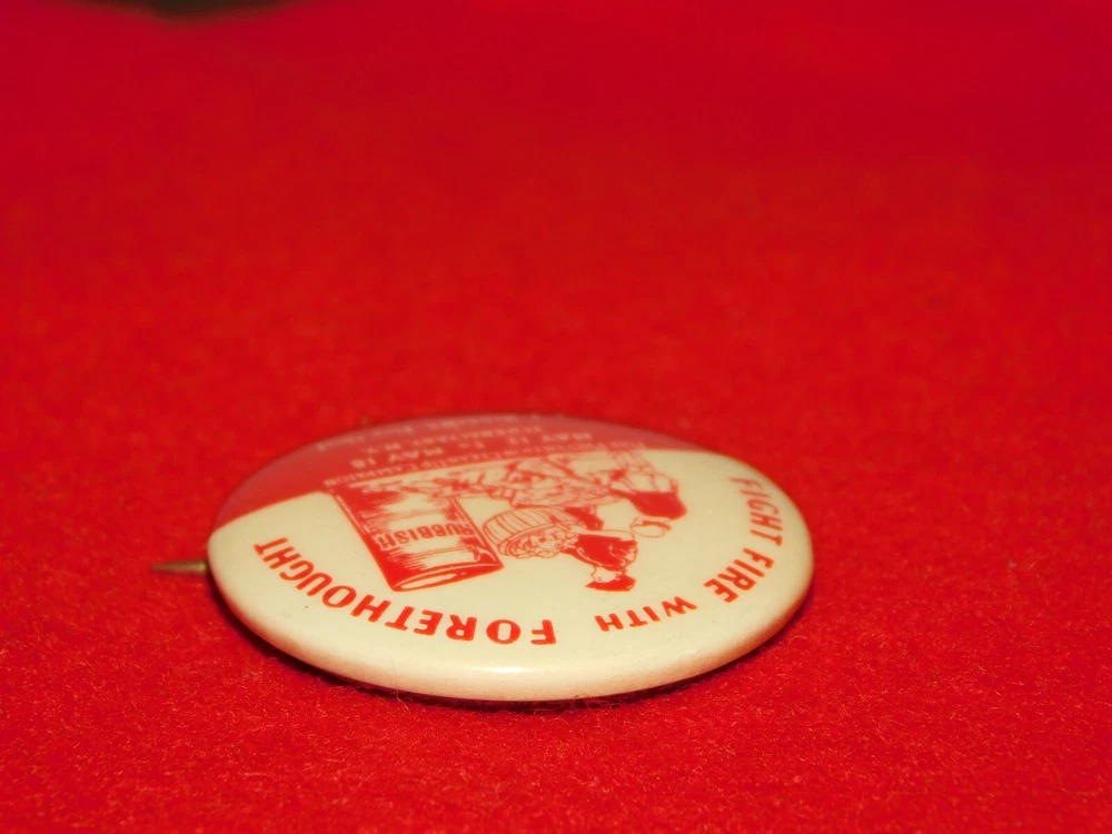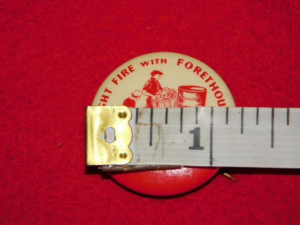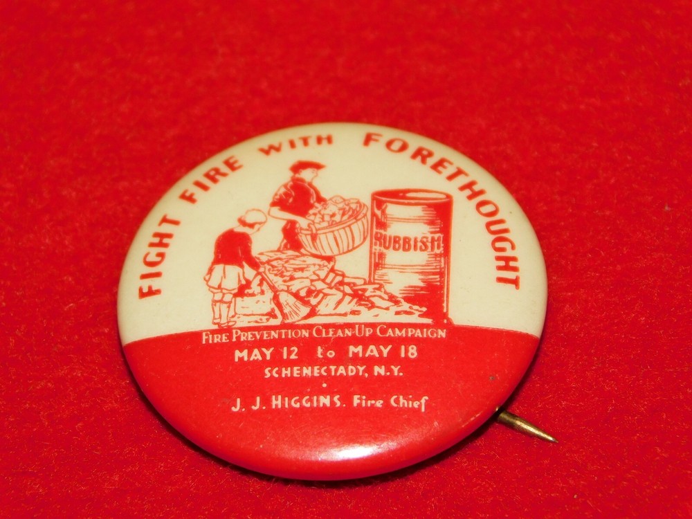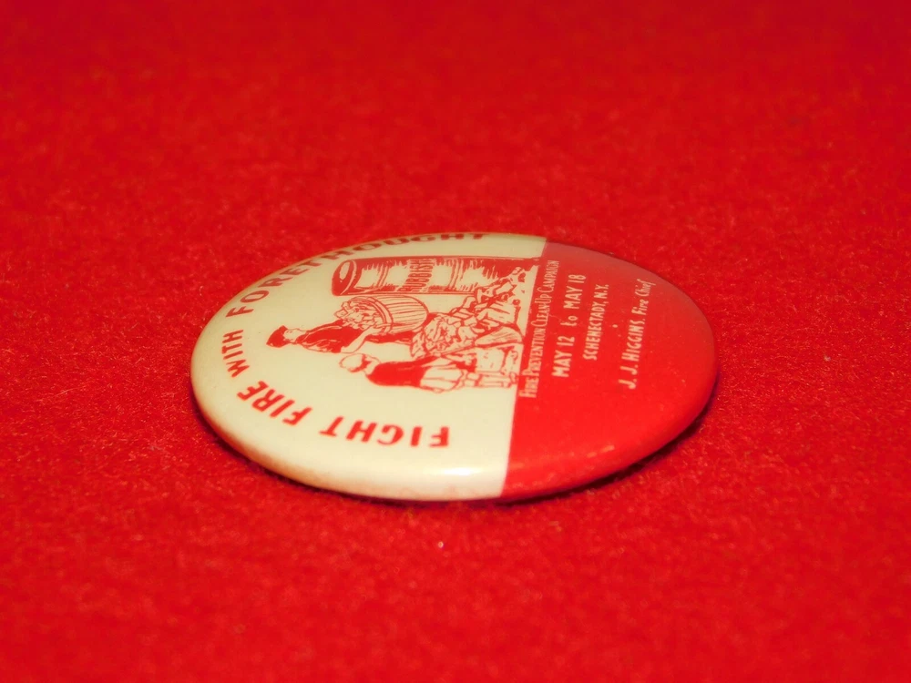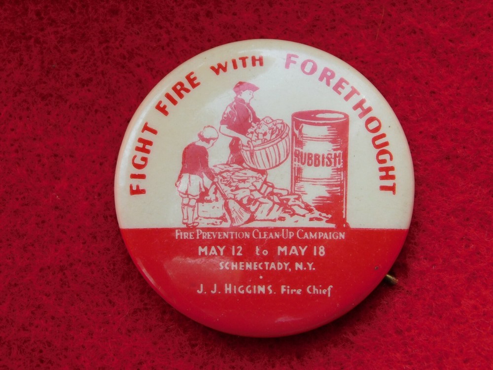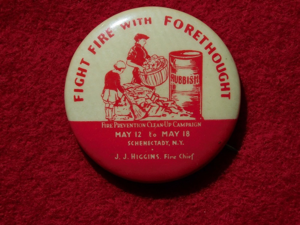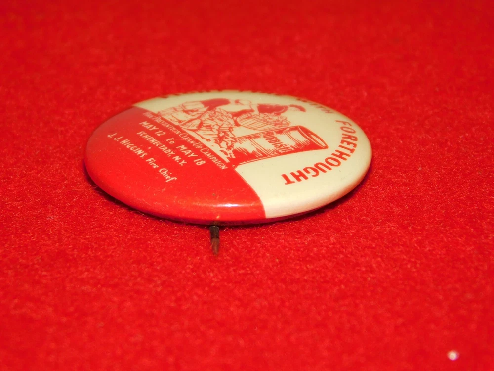 YOU ARE BIDDING ON....... VINTAGE PINBACK BUTTON FIGHT FIRE WITH FORETHOUGHT SCHENECTADY NY CAMPAIGN .. . .. SHOWS HANDLING/AGE WEAR..HAS SCRATCHES/PAINT LOSS/AGE DISCOLORATION..... ..PLEASE VIEW PHOTOS FOR CONDITION.***PLEASE E-MAIL IF YOU HAVE A QUESTION OR WANT AN ADDITIONAL PICTURE....PLEASE VISIT MY EBAY STORE FOR ADDITIONAL VINTAGE ITEMS..THANK YOU***3T-BX0305-PLSBG7403-1