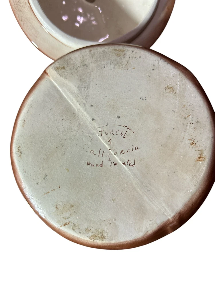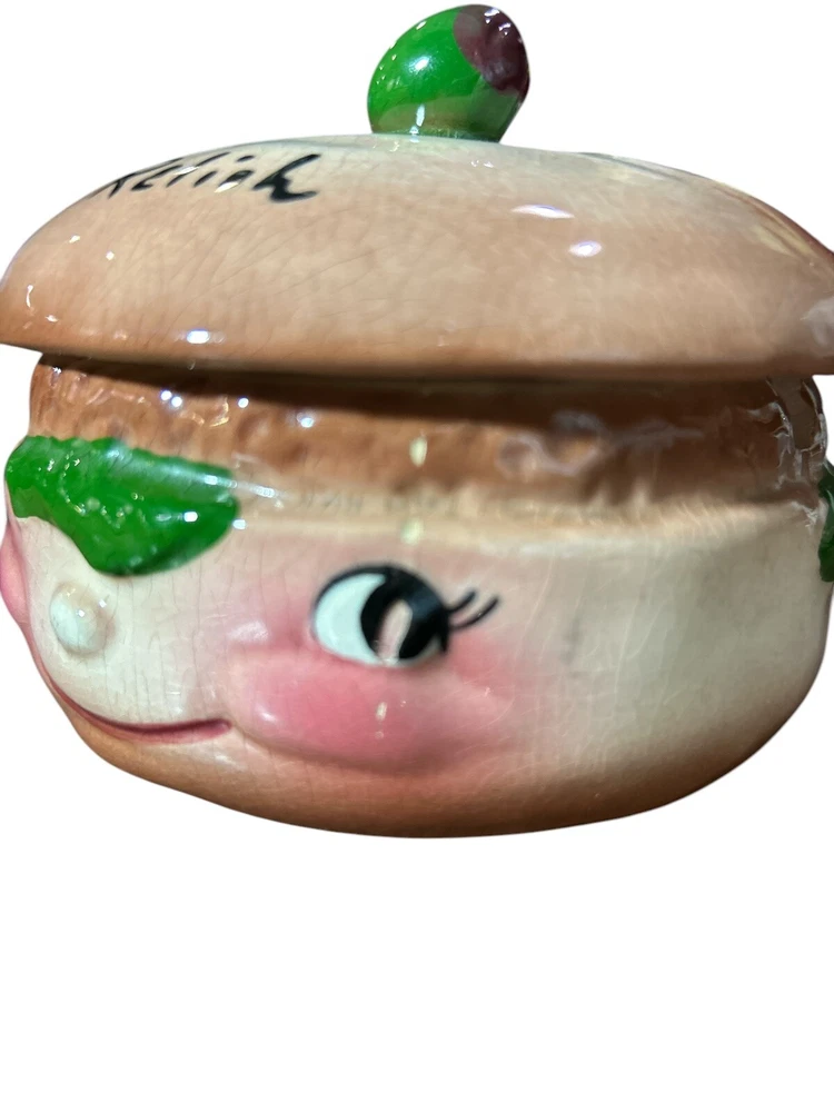 This vintage relish container is a unique addition to any kitchen or collection. Hand painted and made of ceramic, this covered dish features a round shape and a brown color with a hamburger pattern. The dish was manufactured in California in the 1950s and has a time period manufactured of 1950-1959. Measuring 3 1/2 inches in height, 4 1/2 inches in width, and 1 3/4 inches in depth, this dish has one compartment and weighs 1lb. The dish is antique and has a vintage look and feel. It is a perfect piece for those who love unique and one-of-a-kind items.