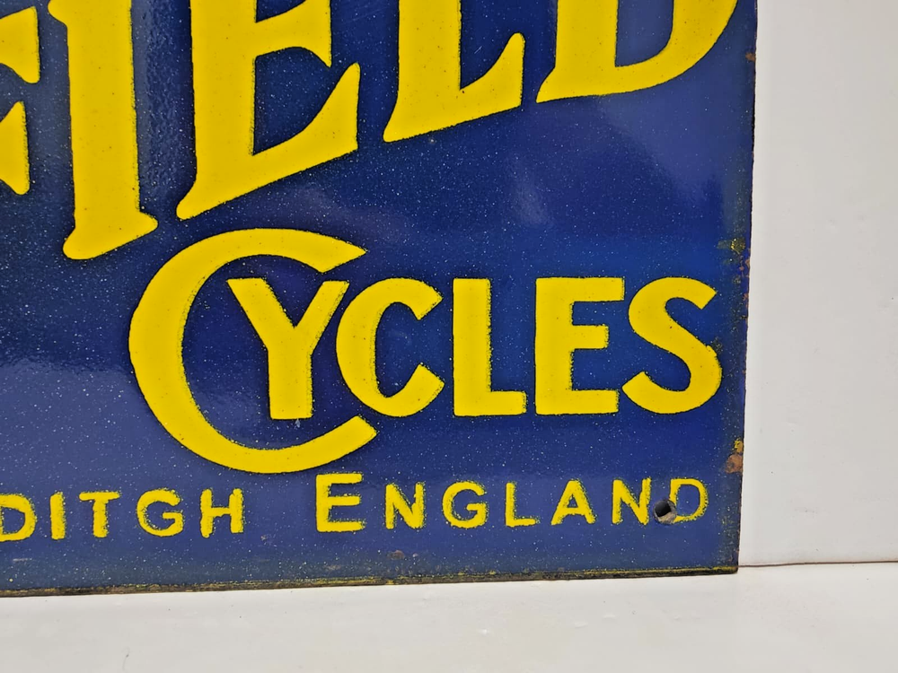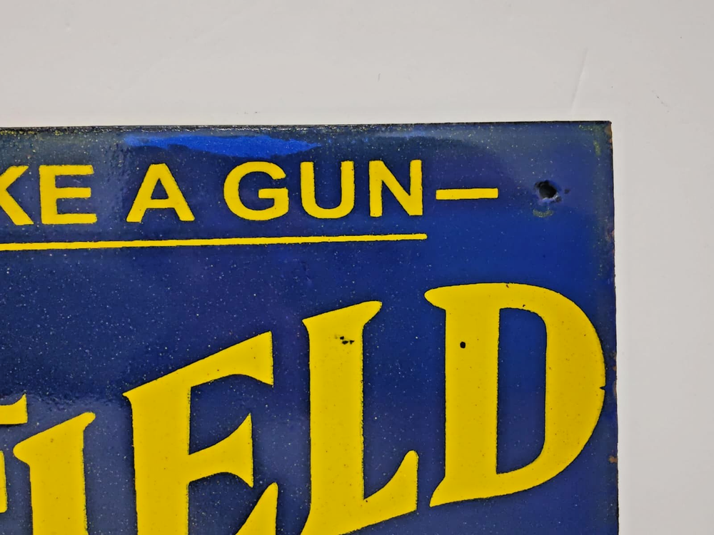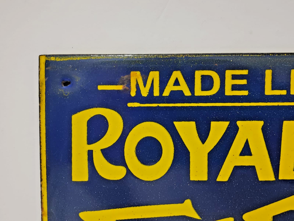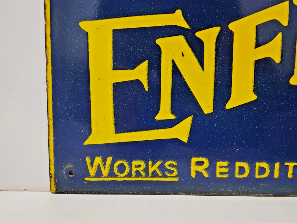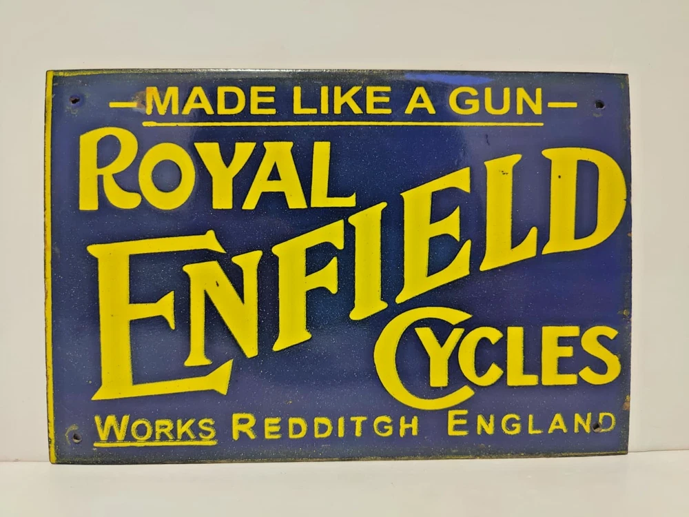 This product is a vintage Royal Enfield cycles metal sign with porcelain enamel, measuring 9" x 6". It features a unique design with a gun-like appearance, reflecting the brand's original advertising theme. Made in the United Kingdom, this collectible item showcases the iconic colors associated with Royal Enfield, making it a desirable addition for enthusiasts of gas & oil memorabilia and advertising collectibles. * Kindly take a close look at all photos - they show the exact vintage sign you'll receive. What you see is truly what you get. * Carefully packed to protect the signs condition and shipped securely with USPS Ground Advantage