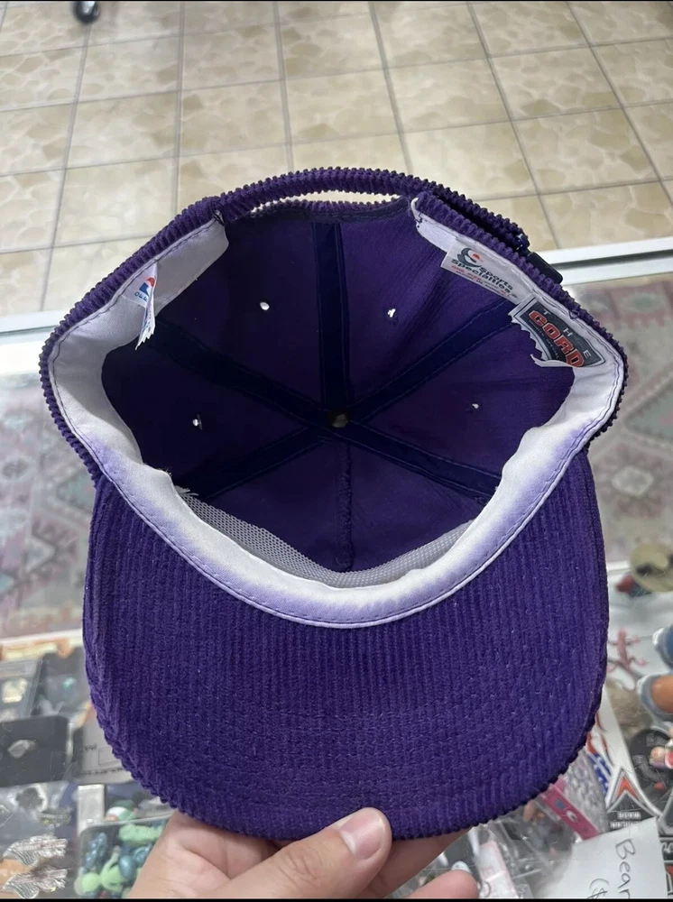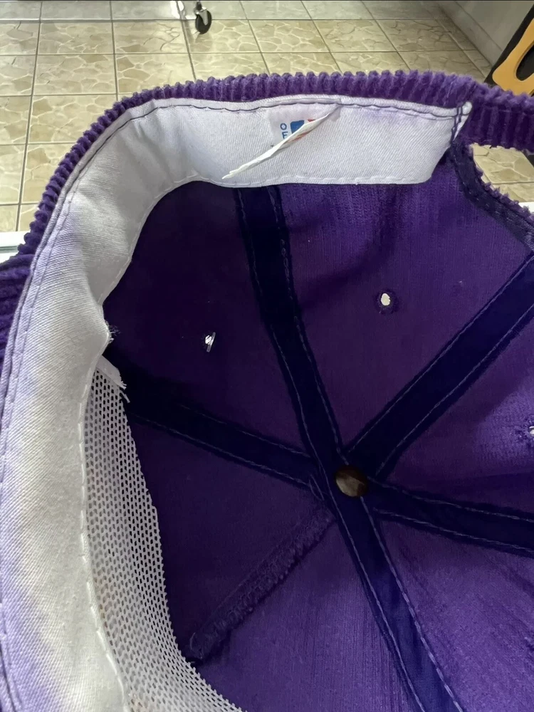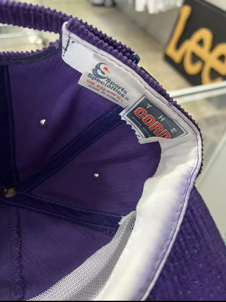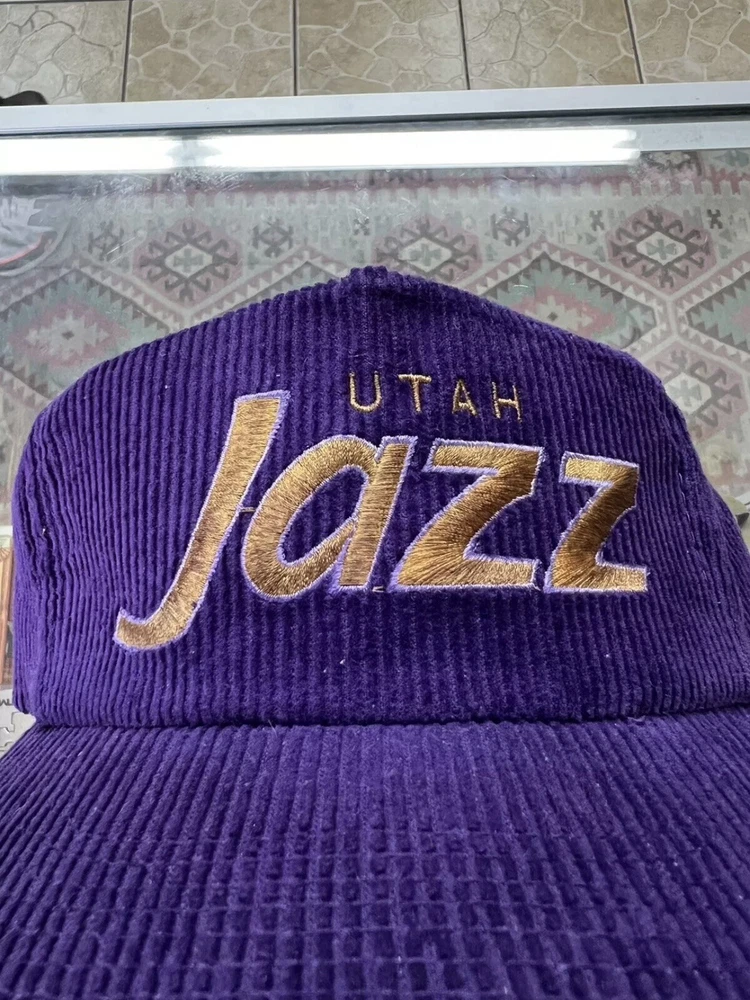 Show off your love for the Utah Jazz with this rare 90s corduroy snapback hat from Sports Specialties. The vintage cap features the team's iconic logo and colors in a stylish purple shade. It's a perfect addition to any basketball fan's collection, whether you're a die-hard Utah Jazz supporter or just appreciate the game. This one size fits all cap is made for comfort and style, with a snapback closure to ensure the perfect fit for any head size. It's a must-have for any fan of the National Basketball Association (NBA) and the Utah Jazz. Don't miss out on this unique and rare item! Light color bleeding as shown on pics other then that super clean