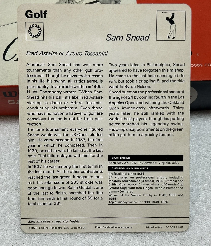 Officially Licensed:YesSport:Golf-PGATeam:PgaModified Item:NoPlayer:Sam SneadGender:Unisex AdultProduct:GolfBallEvent/Tournament:Usga pgagtin13:does not applyCountry/Region of Manufacture:United StatesBrand:WilsonColor:Multi-ColorUPC:does not applySize:standardCapacity:Not applicable
