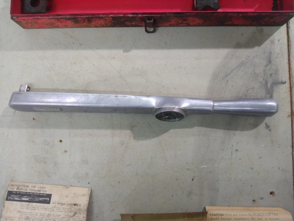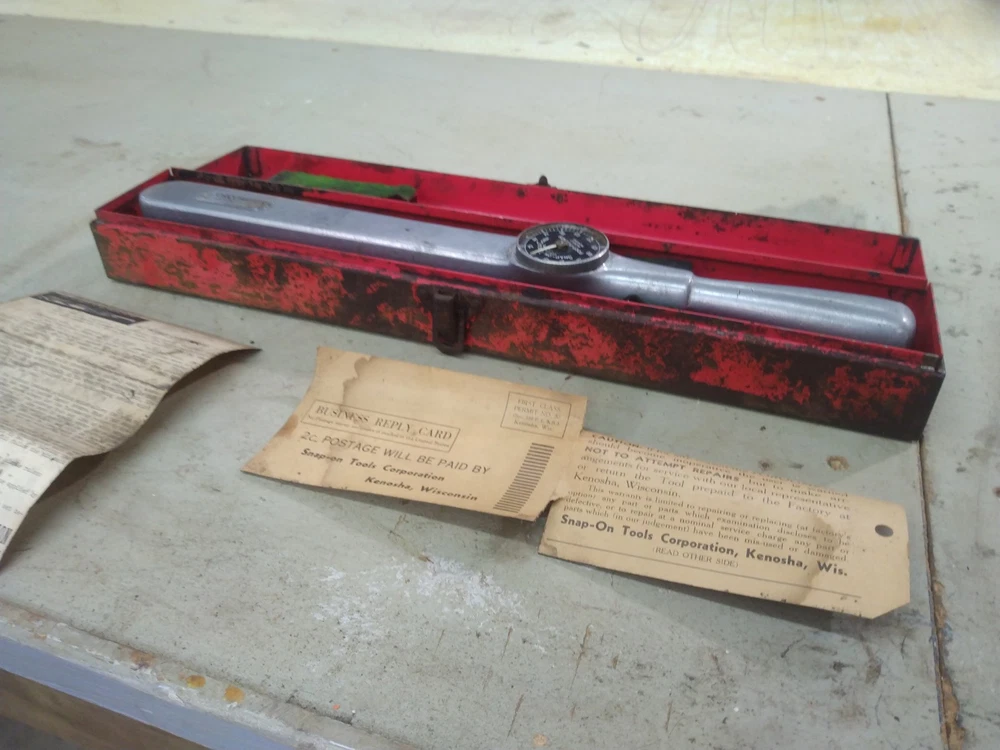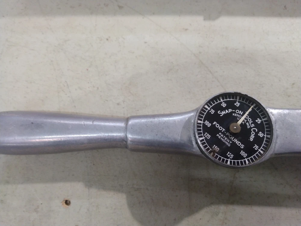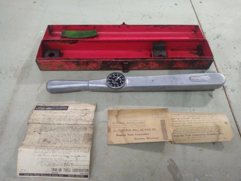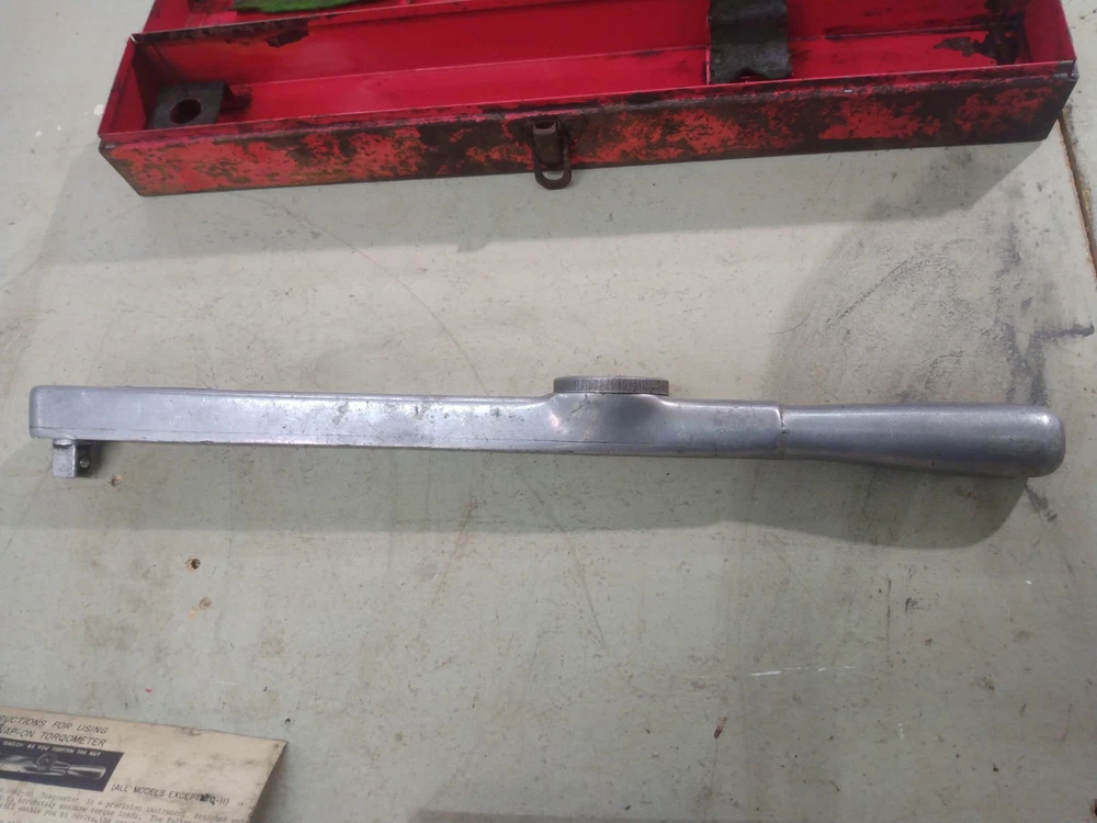 This is a vintage Snap-On TQ15 1/2" drive Torqometer torque wrench with a range of 0-150 ft-lbs. Measures 27" long. Manufactured in the United States. Comes with metal case. Case has rust as shown in the pics. Also comes with instructions and warranty card. This has not been tested. Missing lens on gauge. Being sold for parts or repair.
