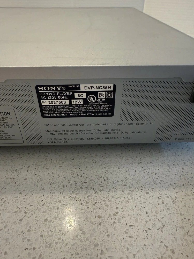 The Vintage Sony DVP-NC875V 5-Disc DVD/ CD/ Super Audio CD Player is a versatile and high-quality DVD player that allows you to enjoy a variety of media formats, including CD, DVD, MP3, and more. With its sleek silver design and digital display technology, this unit is both stylish and functional. Featuring connectivity options such as digital audio, video, and stereo audio outputs, you can easily integrate this DVD player into your home entertainment setup. The inclusion of SACD technology adds an extra layer of audio quality to your listening experience. This 2001 model from Sony is a reliable and sought-after piece for any collector or audio enthusiast.