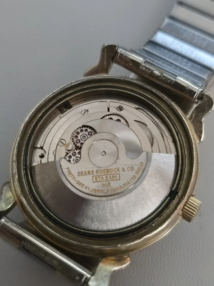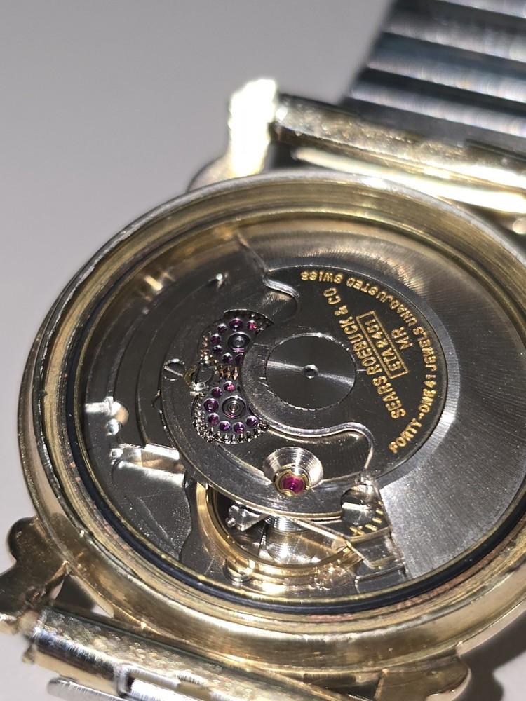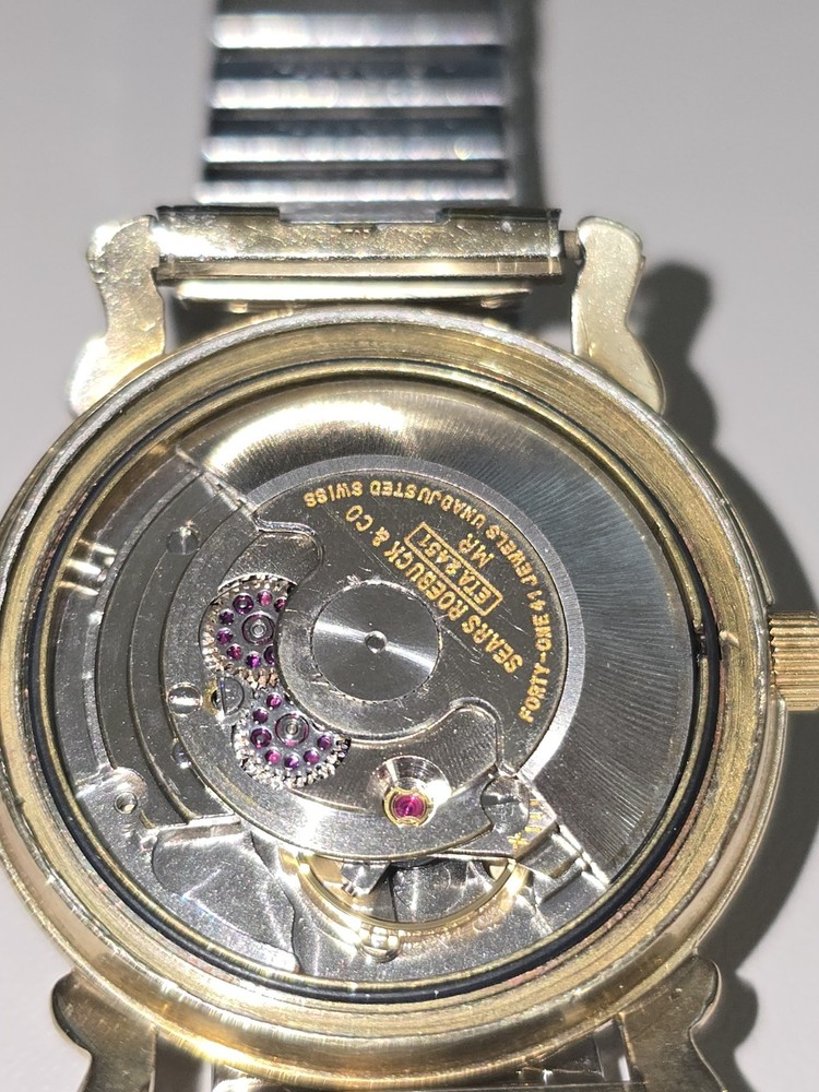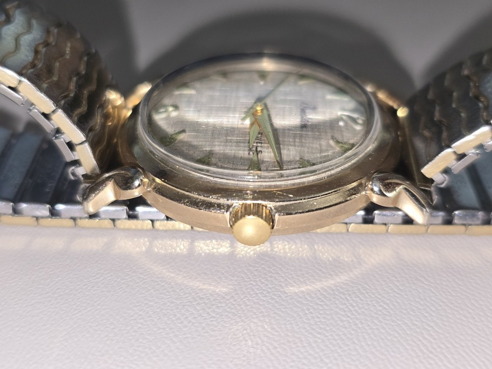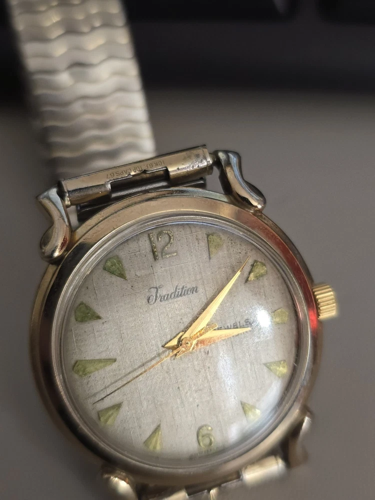 A beautiful Tradition watch by Sears Roebuck for men. The watch has a beautiful gold plated case and dog leg lugs.the crystal has almost no water or discernible marks. The dial is a beautiful linen style with a light patina.