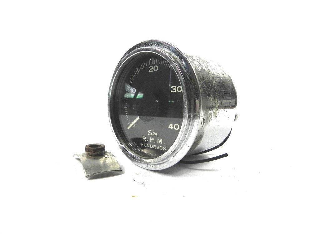 VINTAGE USED 12 VOLT SUN TACHOMETER CHROME 3 3/4 INCH DIAMETER, 3 1/2 INCH DEEP VINTAGE USED 12 VOLT SUN TACHOMETER CHROME 3 AND 3 QUARTERS INCHES IN DIAMETER, 3 AND ONE HALF INCHES IN DEPTH, NEGATIVE GROUND ATTACHED, 0-4000 RPM See photos below for details. Contents included will be pictured. ABOUT US Jones Vintage Parts has been a family-owned business for over 40 years. We specialize in rare and vintage NOS and used parts for all makes and models from the teens to the 70s. We're passionate about uncovering and restoring the stories of the treasures from your grandparents and great grandparents history. We believe in breathing new life into the world's first modes of transportation. New vintage all the time! SHIPPING INFORMATION Purchased items will generally ship Monday through Friday, within 3 days via USPS Flat Rate or First Class upon payment receipt. Larger items will be shipped via FedEx Ground or UPS. Multiple same-day purchases will be combined for discounted shipping (request a revised invoice to receive bulk shipping discount or notify us of future purchases). International shipping also available. RETURN POLICY Our goal is your satisfaction. If you are unhappy with your order for any reason items may be returned for parts credit within three (3) days of receipt, and you will be charged a 10% restocking fee. There are no shipping refunds. Exchanges will be billed appropriate freight. All return items must be complete, undamaged, unaltered and in resale condition. You may be interested in our other eBay listings . Powered by SixBit's eCommerce Solution